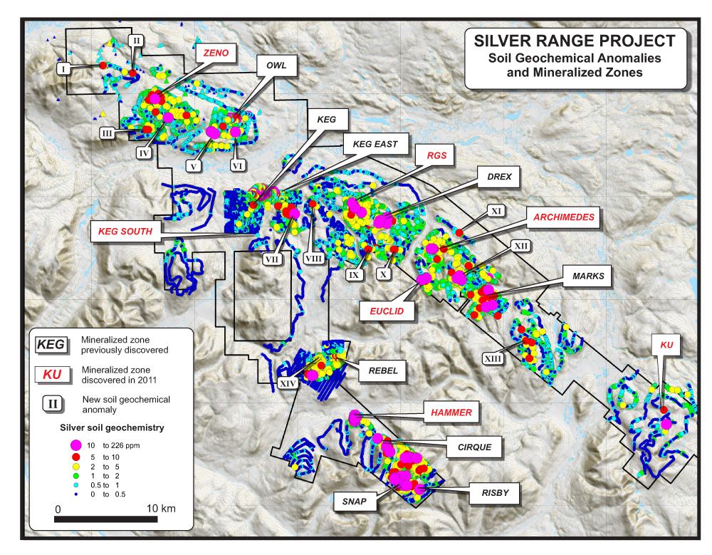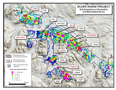 The 2011 field program substantially increased the number of silver-bearing mineralized zones on the Silver Range Project from six to seventeen. These include the previously announced Hammer Zone discovery and three acquired showings. Extensive grid drilling successfully expanded the Keg Main Zone, while scout drilling at the Keg East, Owl, Drex, Rebel and Snap Zones returned encouraging results. Several new discoveries, including the Hammer, RGS and Archimedes Zones, together with the previously-recognized, high-grade Risby and Cirque Zones, represent prime drill targets for 2012. Some of the showings at new anomalies have similar geochemical signatures to the Keg Main Zone while others are richer in more distal indicators, which suggests that they may be underlain by Keg-style systems at moderate depths. Collectively, the mineralized zones and geochemical anomalies have defined two major mineralized belts, the 70 km long Tay Trend, and the 17 km long Mount Mye Trend. Maps related to the Silver Range Project can be viewed at www.silverrangeresources.com.