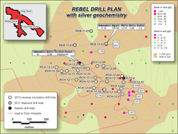 Nineteen shallow reverse circulation drill holes (1105 m) were completed at the Rebel Zone in 2012 targeting near-surface, bulk mineable mineralization. All holes intercepted volcaniclastic rocks, which are oxidized from surface to the maximum depth of the holes (61 m). Broad intervals of low to medium grade mineralization were encountered, including drill hole RCH-12-07 which averaged 11.49 g/t silver, 0.14% lead, 1.17% zinc, 0.10% copper, 275.2 ppm tin and 32.65 ppm indium over 25.90 m. Six holes ended in mineralization. Results for all Rebel reverse circulation drill holes are available at www.silverrangeresources.com.