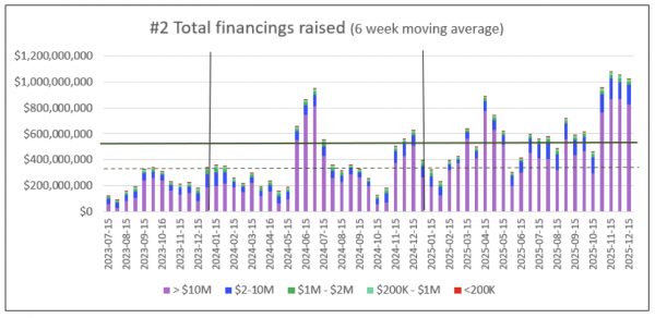 Total financings raised are in “good” territory, recently well above the $550M per two-week threshold for a good market. In fact, the unfiltered financings for December 1-15 were C$1.70B, the second highest since June 2023, second only to the latter half of October this year. In aggregate, markets are in good condition but keep in mind this figure is dominated by a small number of very large financings. At the bottom end of the market, it’s a different story. The amount of money being raised in critical smaller financings (< C$2M) is at best “okay”, beating the C$35M basement threshold.