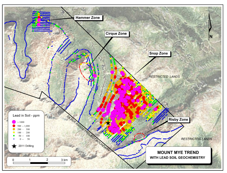 The Snap Zone lies 6 km southeast of the Hammer Zone within the Mount Mye Trend. It is associated with an exceptional soil geochemical anomaly, where strongly to very strongly anomalous silver (2-75.8 g/t), lead (200-7,360 ppm) and tin (20-302 ppm) values occur over an area measuring 3,700 by 2,250 m. The first phase of reconnaissance drilling has tested approximately 3% of the geochemically anomalous area to relatively shallow depths.