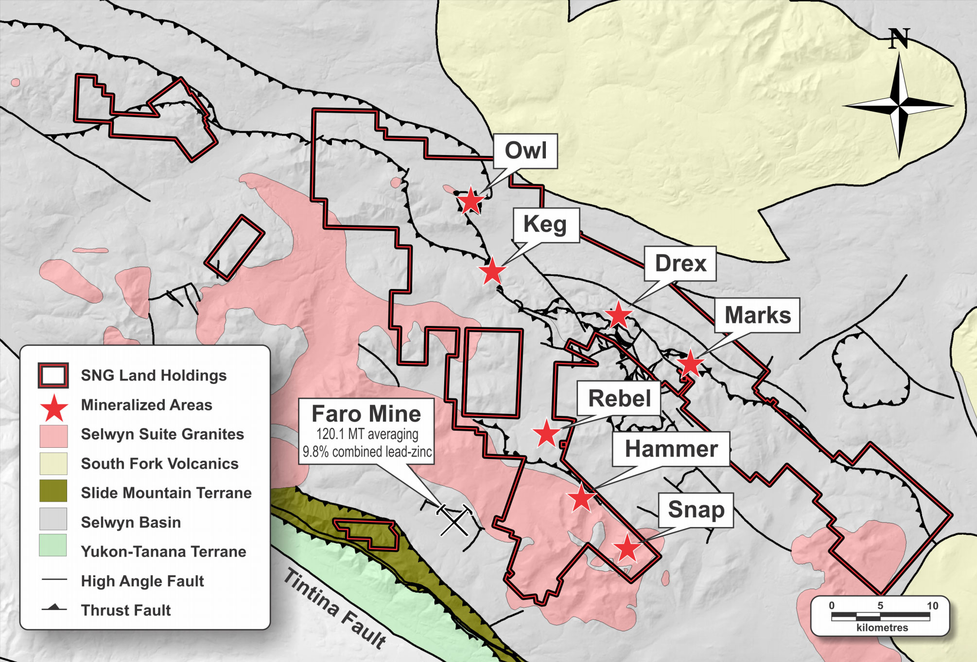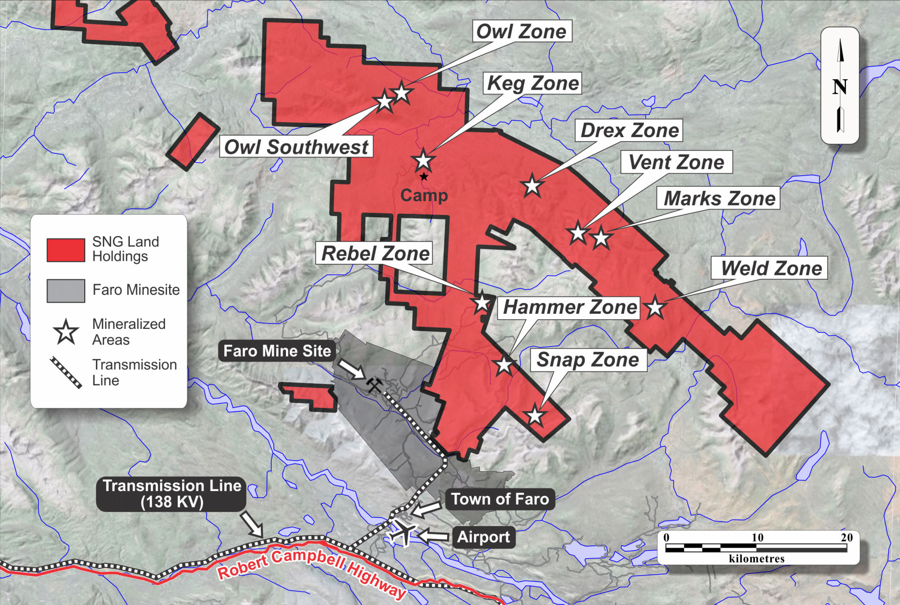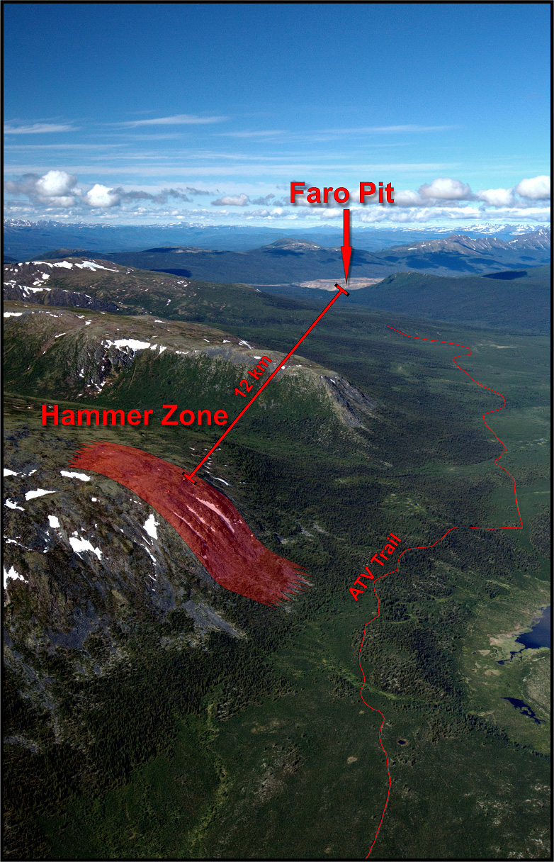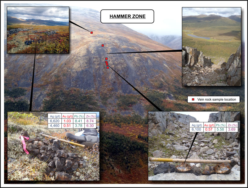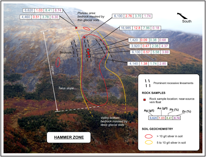 The Hammer Zone is a bonanza-grade silver-rich epithermal vein system that was discovered in late 2011. It is located only 12 km from the Faro mine and mill site. High-grade rock samples assaying from 1,420 to 16,985 g/t silver were collected over a 350 m strike length and are associated with a 700 m long by 100 to 200 m wide soil geochemical anomaly. This anomaly is characterized by very high silver (5 to 68.6 g/t) and antimony (2.64 to 27.2 ppm) values and extends under glacial cover at both ends.