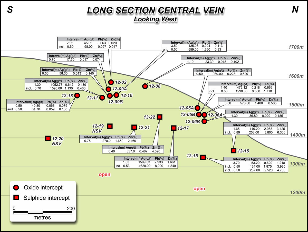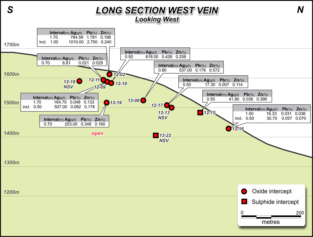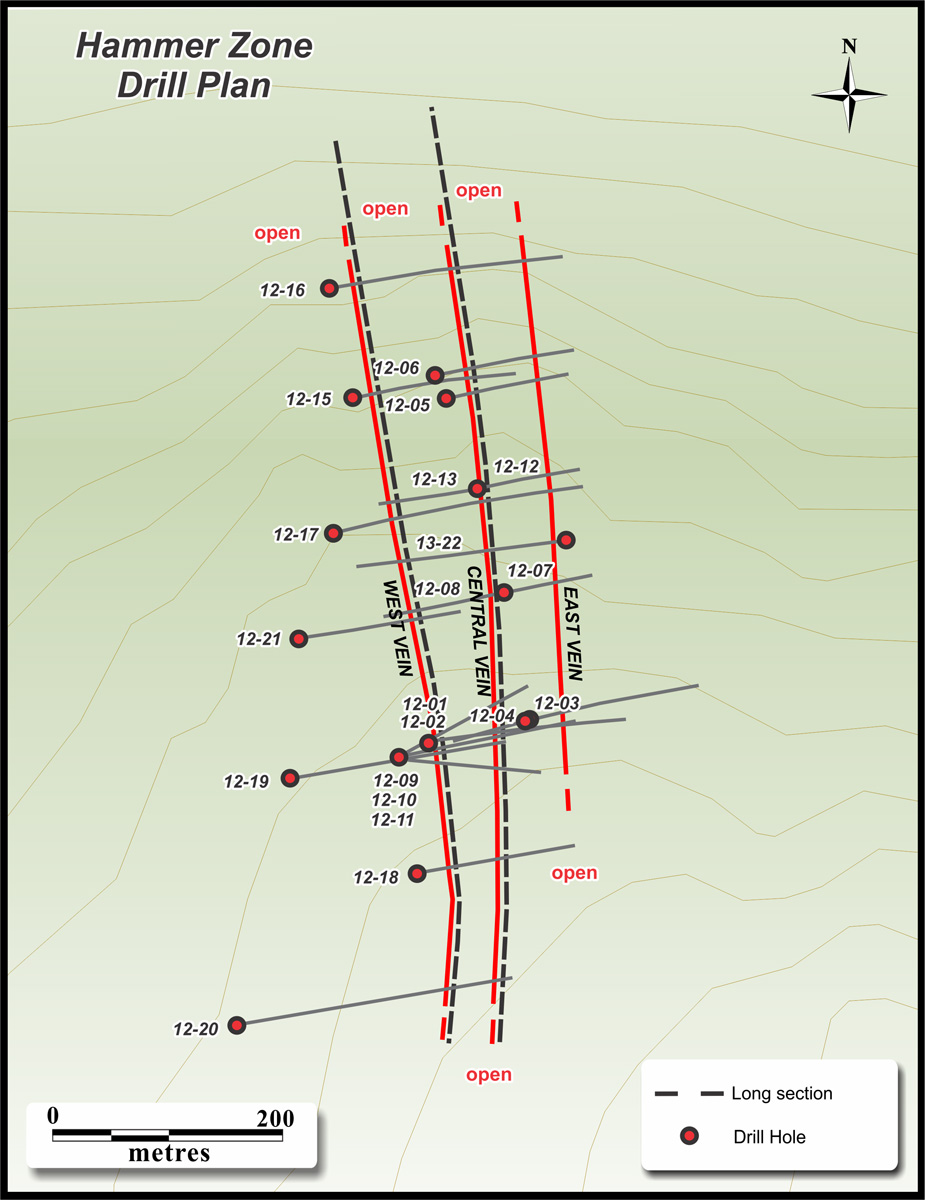 A total of 20 holes (4,197 m) have been completed at the Hammer Zone since 2012. Broadly-spaced drilling traced three subparallel veins for strike lengths of up to 600 m and through a vertical range of 280 m. Fifteen of the 20 drill holes intercepted one or more veins in a grade range between 237 and 4,620 g/t silver. The weighted average of 16 individual vein intercepts is 807 g/t silver over an average drill intersected width of 0.66 metres. All veins are open for extension along strike and to depth. Highlight drill holes at the Hammer Zone include: