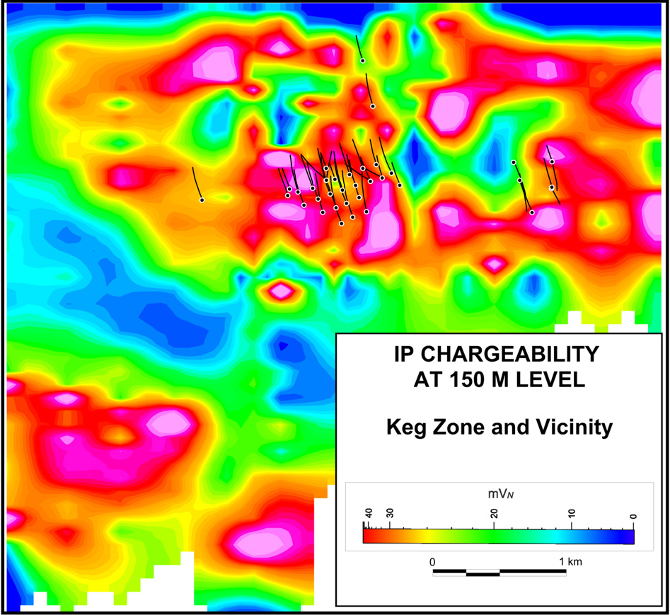 Metallurgical results show that the Keg Deposit mineralization responds very well to conventional copper/lead/zinc flotation processing with excellent recoveries of payable metals. Cross-sectional views indicate a favourable orientation of the mineralized zone relative to topography. The mineralization remains open along strike to the west and downdip. Highlight drill holes at the Keg Zone include: