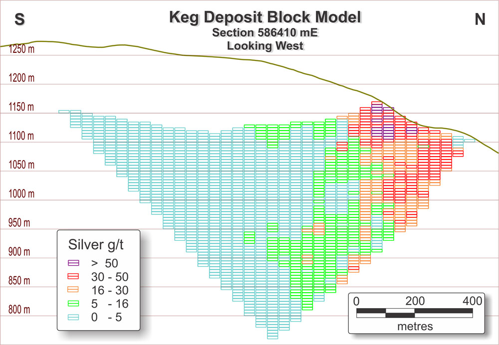 At a cut-off grade of 16 g/t silver, the Keg Deposit hosts an inferred resource of 39.8 million tonnes grading 30.3 g/t silver with contained metal estimates of 38.7 million ounces of silver, 675 million pounds of zinc, 228 million pounds of lead, and 131 million pounds of copper: