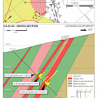 Gold on the Yuge property occurs with arsenopyrite in mesothermal quartz veins and adjacent wall rock. These occur in sub-parallel shear zones up to 60 m wide and over 1,200 m long. Selected surface grab samples collected on the property by the Nevada Bureau of Mines and Geology returned assays up to 15 g/t Au and similar samples collected by Homestake Mining Company assayed up to 53.0 g/t Au. Highest gold grades were reported from near-surface oxidized vein material where documented run-of-mine sorted ore assayed greater than 34 g/t Au and reported sampling of a crown pillar returned 2.4 m @ 16.8 g/t Au including 0.6 m @ 50.7 g/t Au. Sulphide ore occurs at depths greater than 30 m with arsenopyrite-rich material reportedly assaying greater than 17.4 g/t Au. A reported true-width drill intersection in this material at 49 m depth returned 3.3 m @ 9.70 g/t Au. Historical drilling intersected gold mineralization or open stopes in all holes reported but only to a maximum depth of 100 metres. Silver Range believes there is considerable potential to discover similar mineralization at depth given the mesothermal character of the veins and shears and the considerable depth extent of gold mineralization in deposits of this class.
