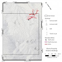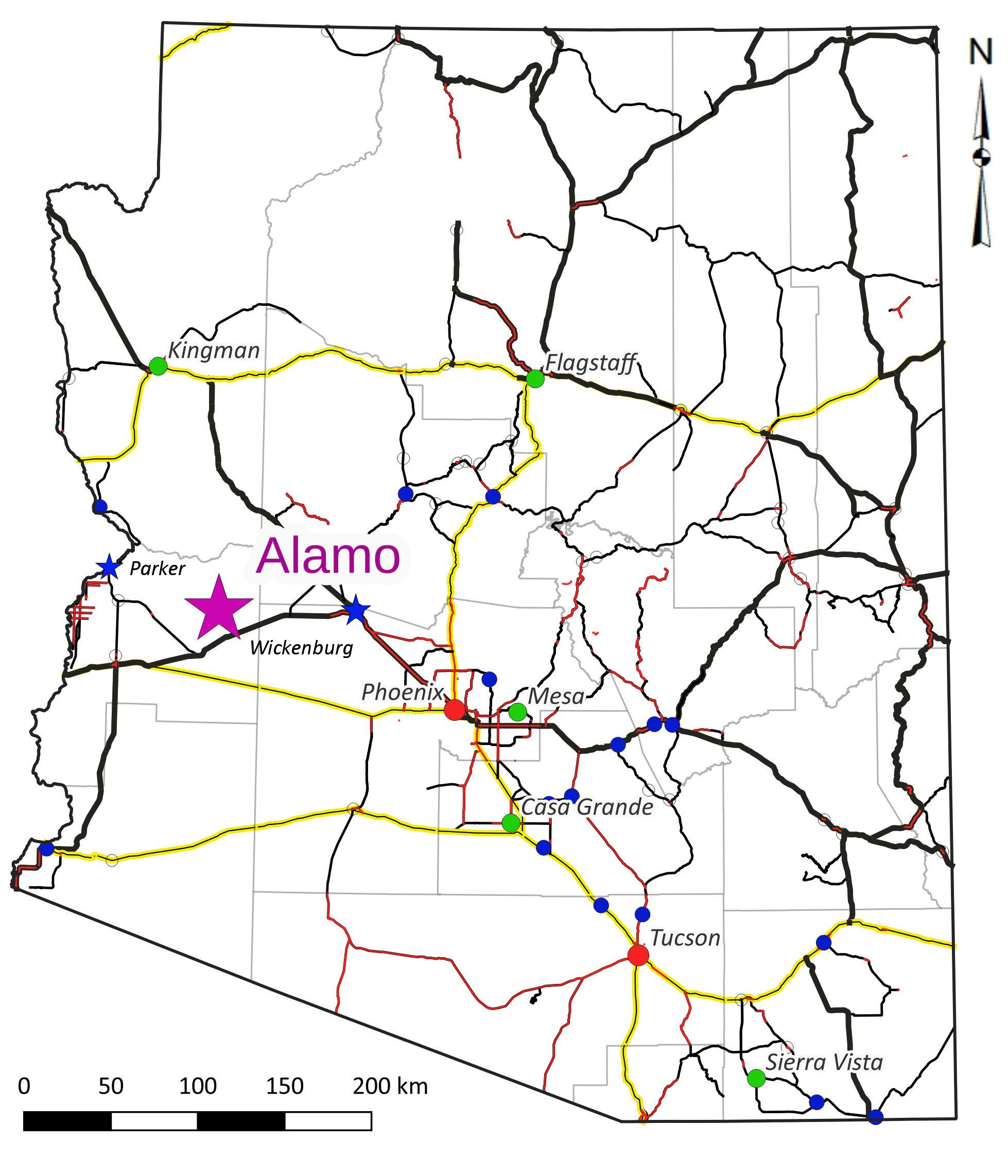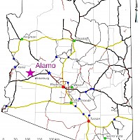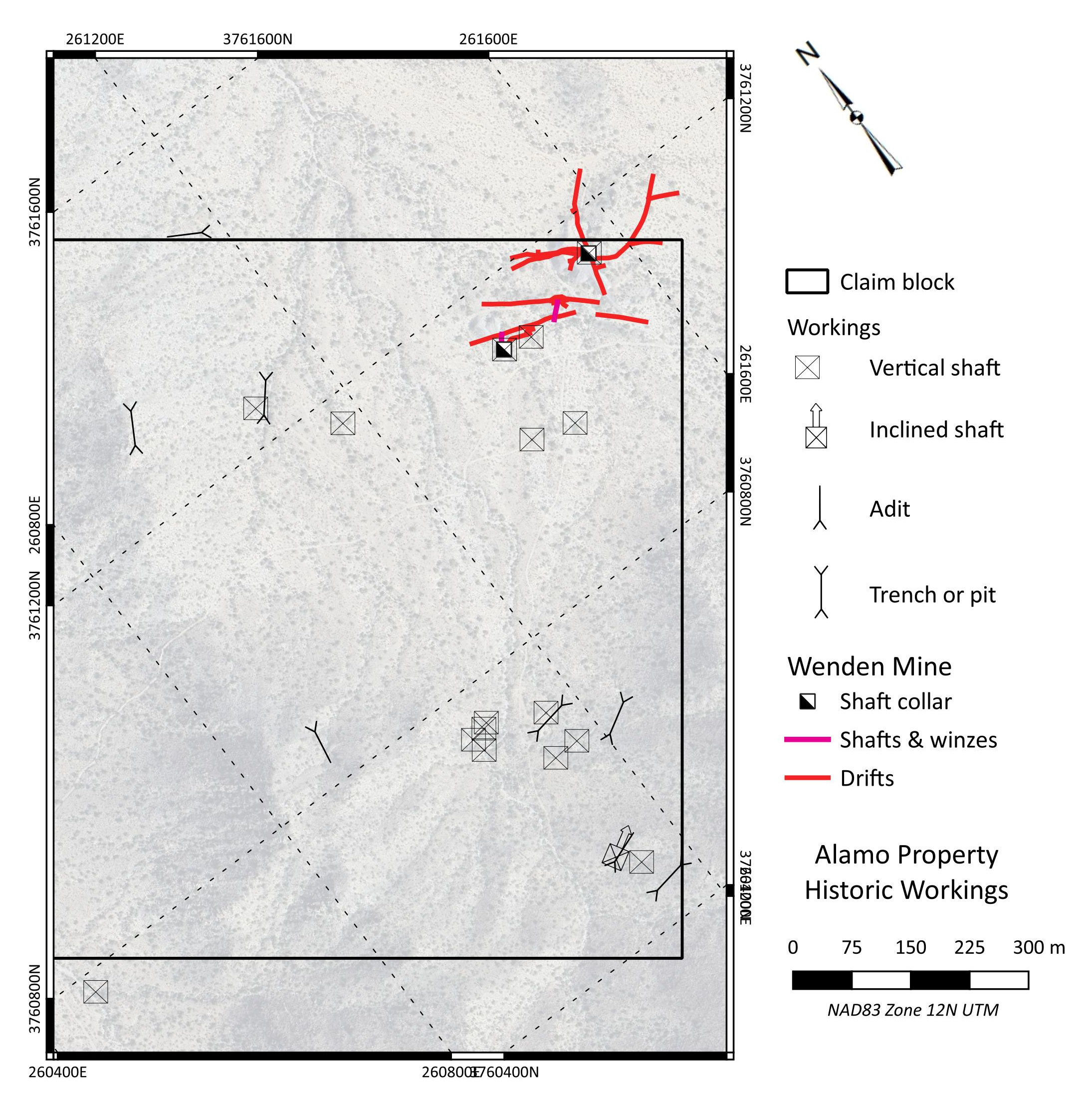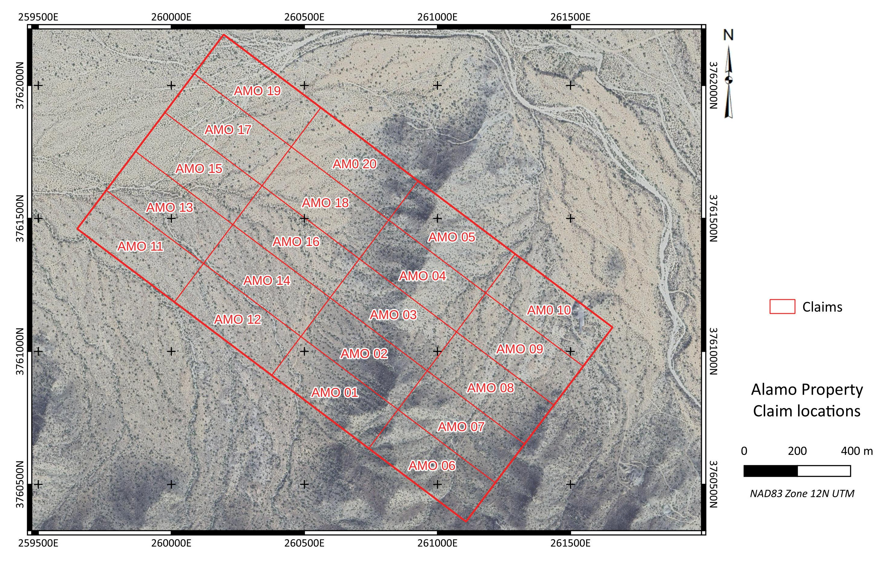 The Alamo Property consists of 20 Federal Lode claims centred at 33o58’ 45” N 113o 35’ 11” W in Sections 3, 10, 11 and 14, Township 7N Range 13W, La Paz County, Arizona. The claims are staked on BLM Land with no surface impairments. The Alamo Property is 68 km east of Parker, AZ and accessible by 4WD roads from Wenden, 16 km south of the property.