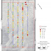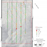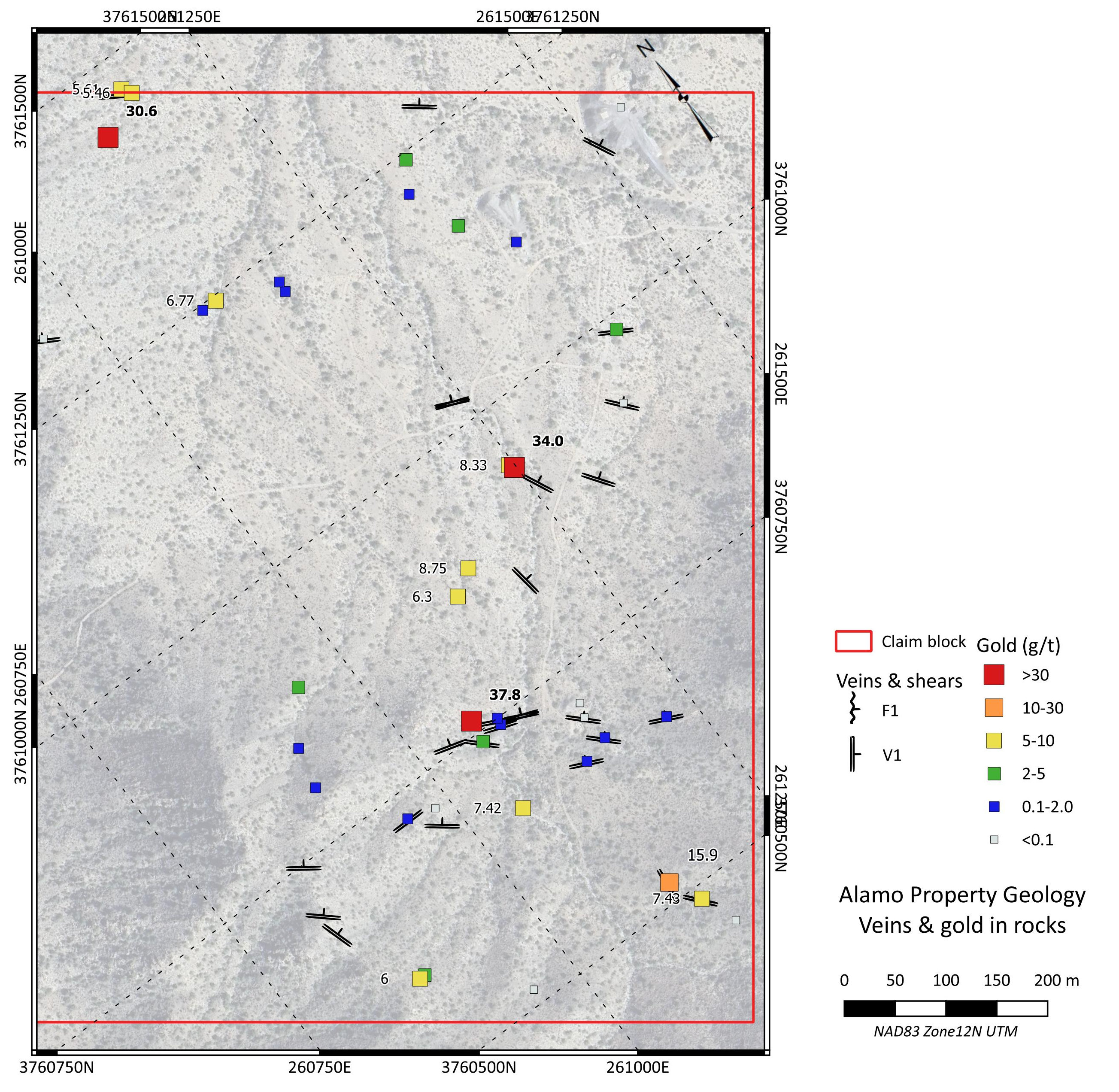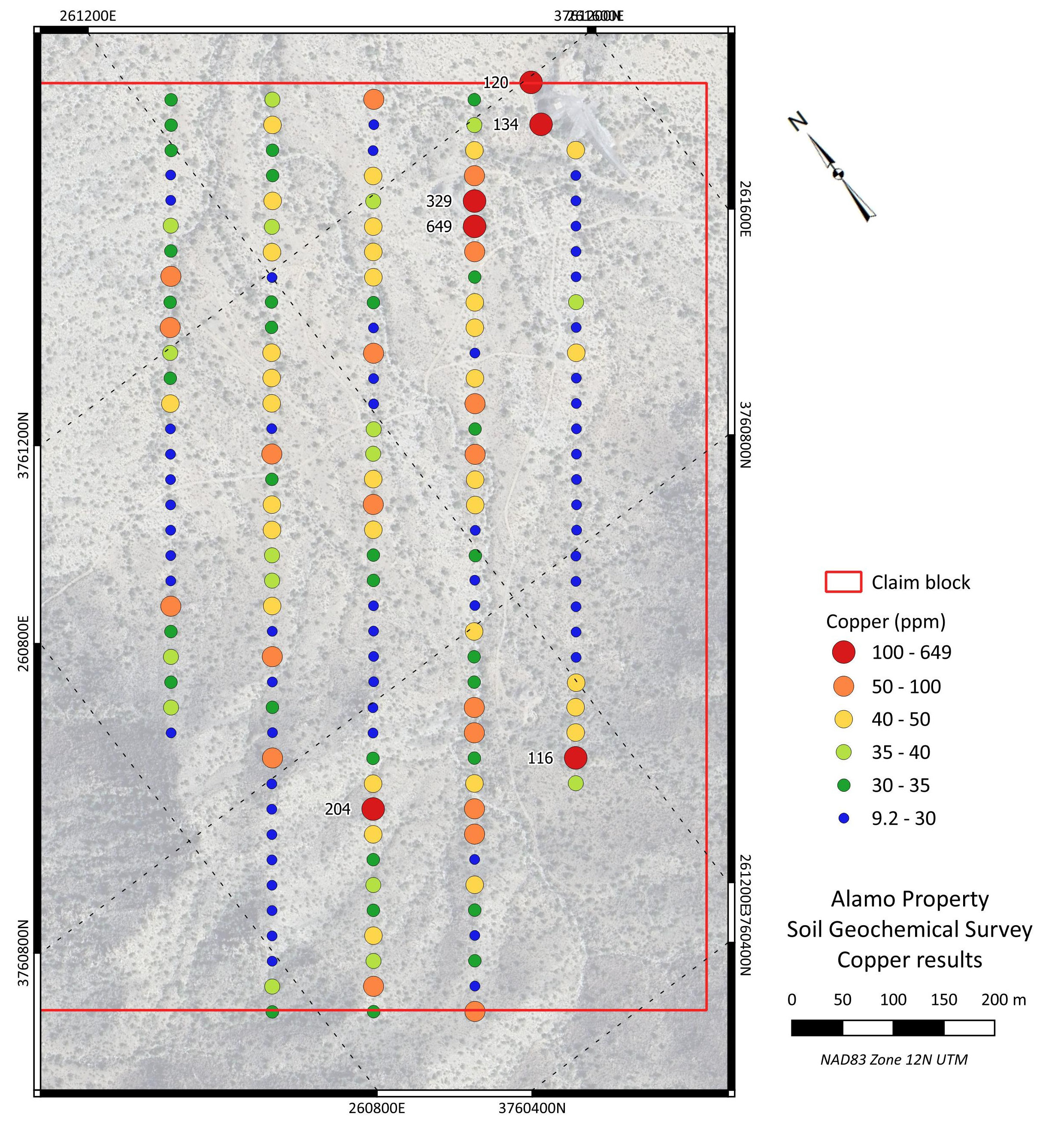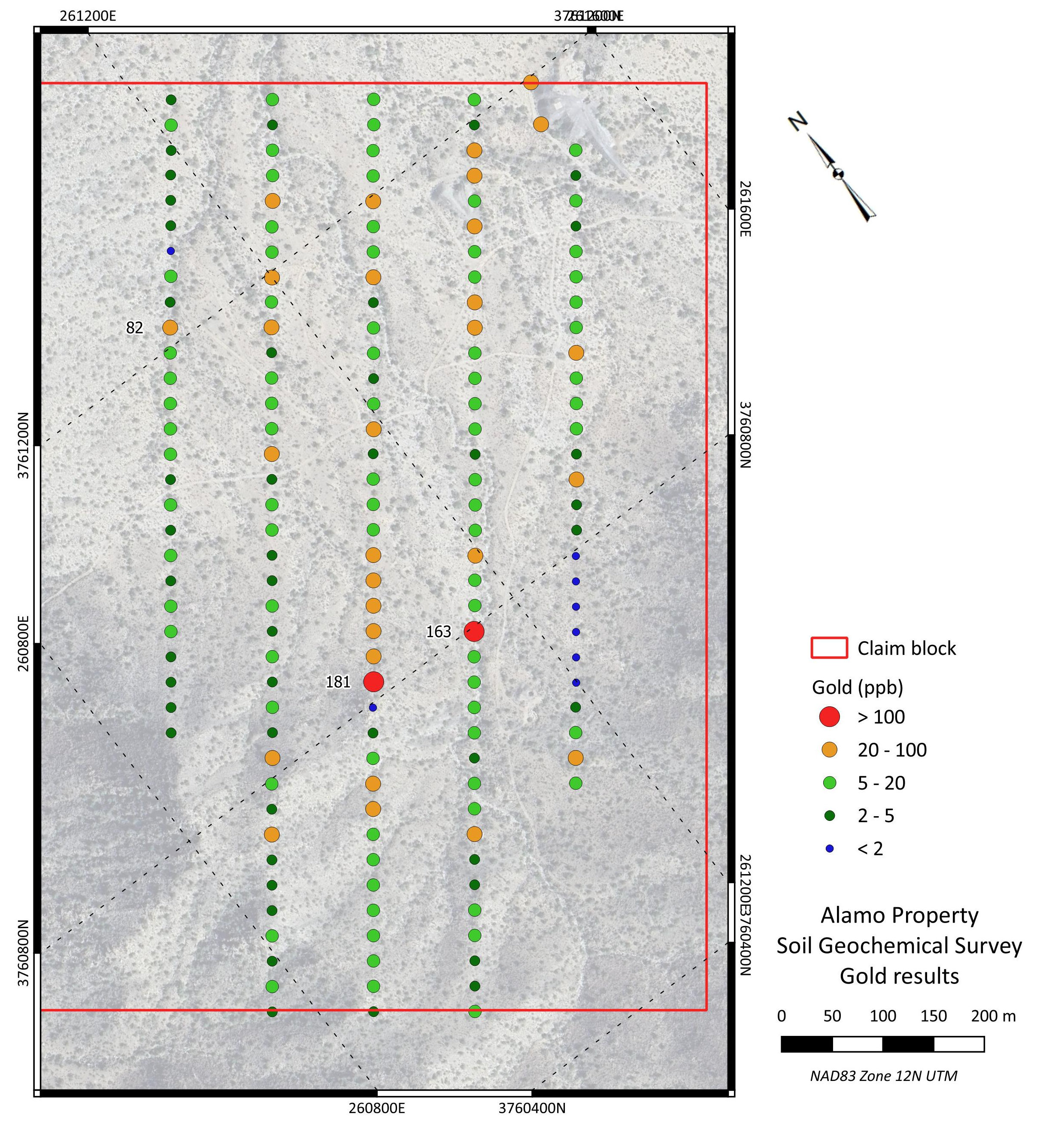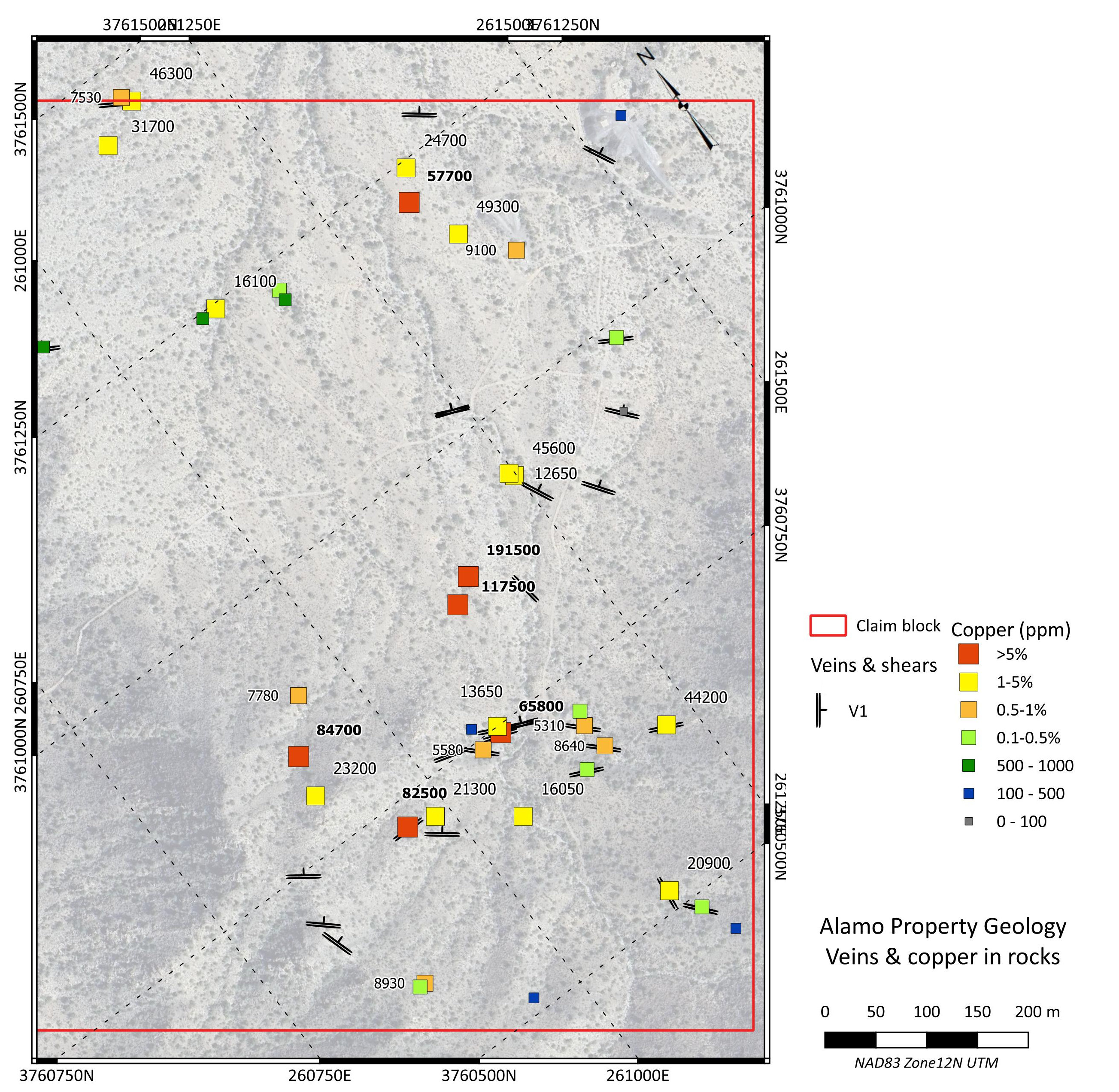 Silver Range acquired the Alamo Property by staking in February 2025 and has conducted geological mapping, sampling, soil geochemical surveys and VLF-EM surveys on the property since then. Sampling to date has returned up to 37.8 g/t Au and 19.15% Cu. Gold grades in surface grab samples collected to date (48) average 4.39 g/t Au with 27% returning more than 5 g/t Au. Copper grades in the same set average 2.47% Cu with 33% returning greater than 2% Cu. Soil geochemical survey in the eastern portion of the property mapped a large gold in soil anomaly greater than 20 ppb Au with maximum response of 181 ppb Au. Copper values in the same data set mapped more discrete anomalies, two of which were associated with mine workings and with maximum response of 649 ppm Cu. VLF-EM surveys identified 5 conductors in the eastern portion of the property, four of which are associated with known mineralization.