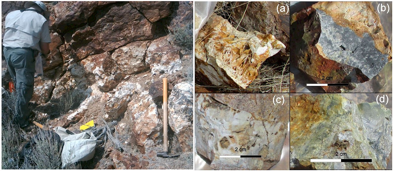 Quartz-flooded, brecciated outcrop exposing two-phase fluid alteration and mineralization (left); and right (a) bladed quartz-after-calcite texture; (b) ginguro bands within collioform quartz veins with highest-grade Au samples; (c) brecciation and annealing with relict cockade quartz; and (d) local Ag-rich sulfide bloom.