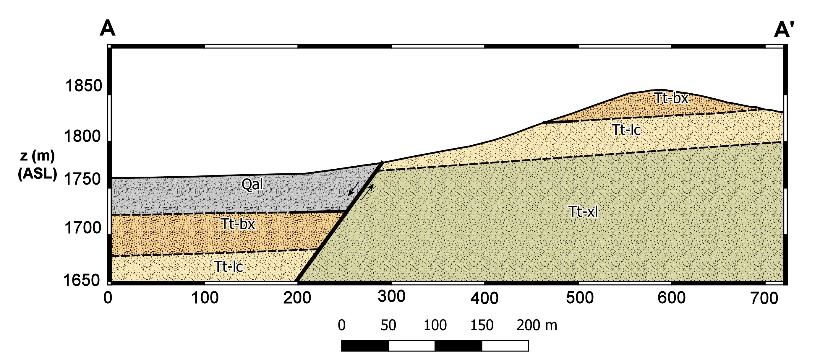 Gold mineralization at Cold Springs is truncated on the west flank of the central hill by a north-striking range front normal fault which has down-dropped the western portion of the hydrothermal mineralization to the west. Drill holes west of the fault suggest that bedrock depths beneath alluvial cover are in the order of 60 to 80 m within 100 m of the fault trace. The maroon tuff breccia capping the hill at Cold Springs has been encountered in two angled drill holes; these cut hanging wall rocks, passed through the fault and were completed in barren footwall rocks east of the fault.
