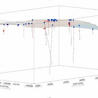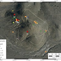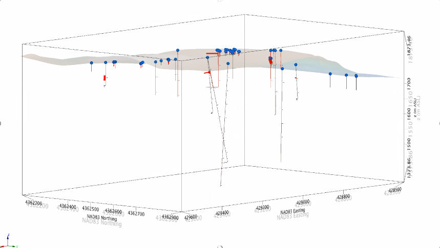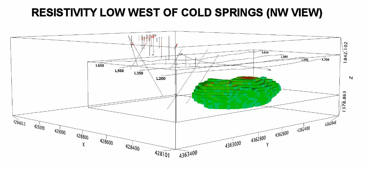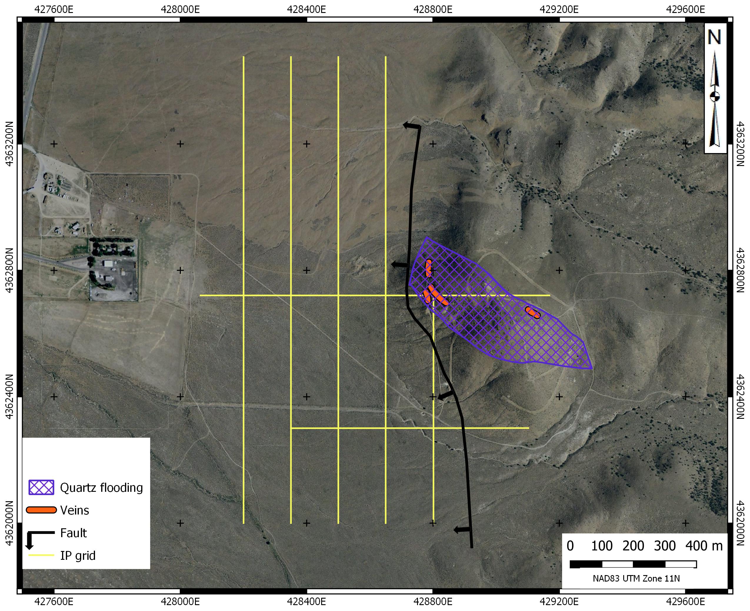 In October 2018, Silver Range completed a three-dimensional induced polarization and resistivity survey over a grid centred west of the mineralization and extending for approximately 400 m west of the range front fault. This survey identified a large, compact zone of low resistivity (< 35 ohm-m) approximately 200 m west of the range front fault and west of exposures of second stage high-grade low sulphidation veins on the west flank of the central hill. This zone extends deeper than the detection limit of the survey (approximately 200 m below surface) and has a top at around 80 m, the inferred approximate depth to bedrock beneath alluvium in this area. This zone of low resistivity is interpreted to be a region of advanced argillic alteration enclosing the steeply dipping source of the hydrothermal system which includes the high-grade vein exposures on the central hill. Silver Range considered this zone of low resistivity to be a prime drill target, well supported by geology.