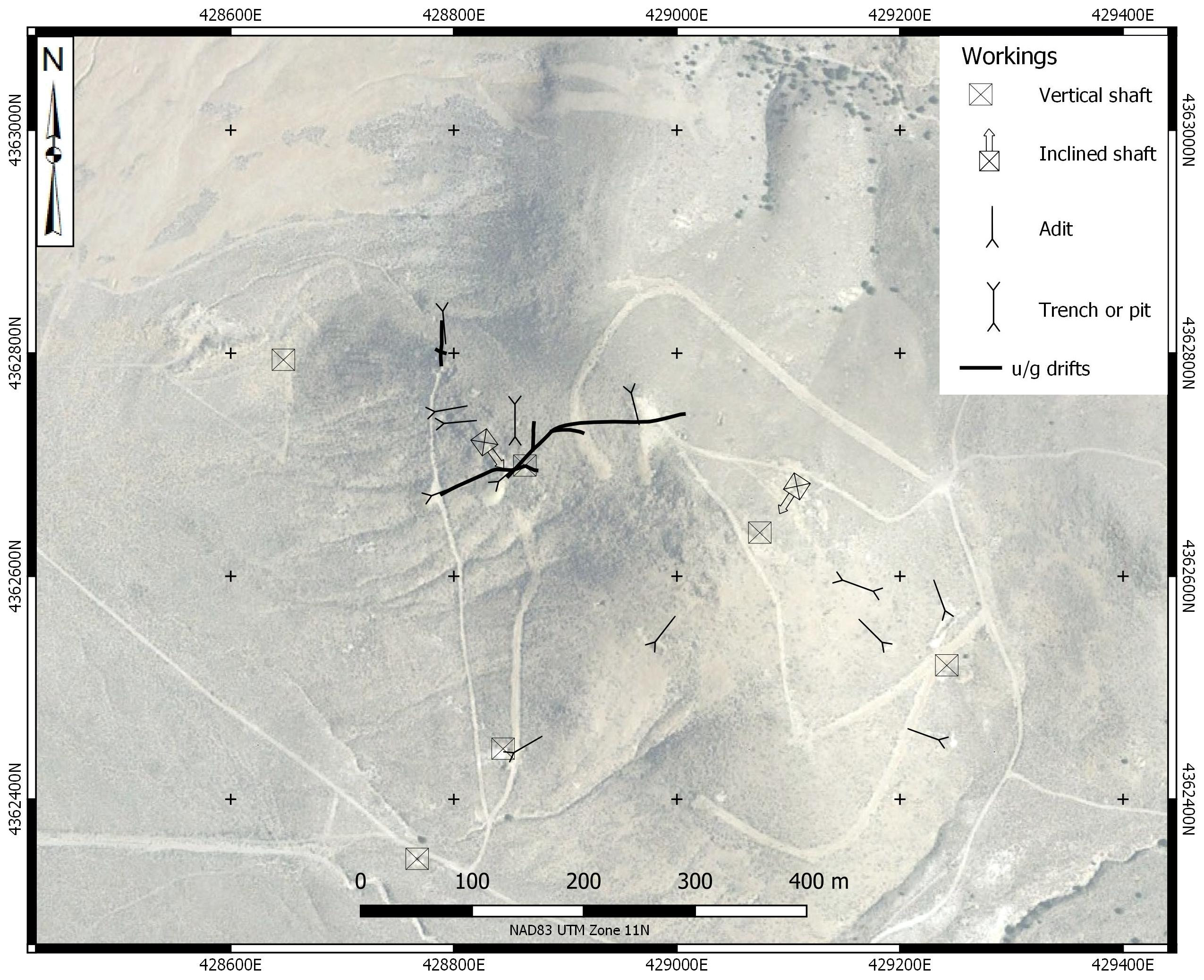 The Cold Springs property is located 80 km east of Fallon and 66 km west of Austin in Churchill County. Records from 1935 indicate that the property was explored since the 1860’s while staking records date from 1907. It was explored intensively by G. Peer from 1950 to 1980 with 400’ of shaft sinking, 2000’ of underground drifting and CAT trenching. There have been five rounds of drilling on the property: Phelps Dodge (1981), ASARCO (1983), WX Syndicate (1987-88), Northern Abitibi Mining (2006-2007) and Supernova Metals (2021) with a total of 52 holes completed. The property was restaked by Silver Range in 2016 and explored by prospecting, sampling, geological mapping and geophysical surveys in 2016 and 2018.