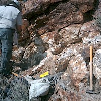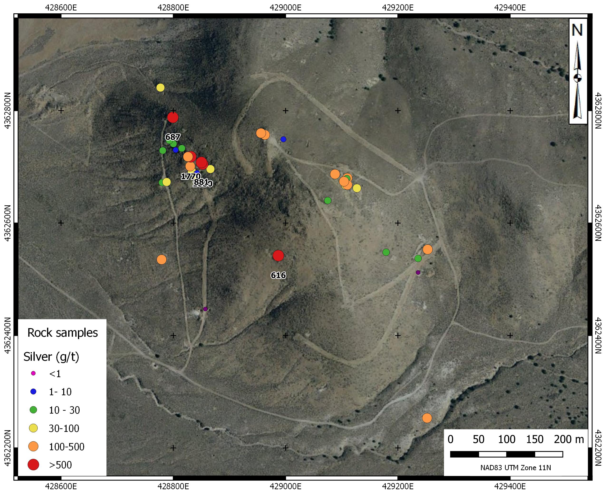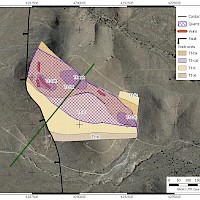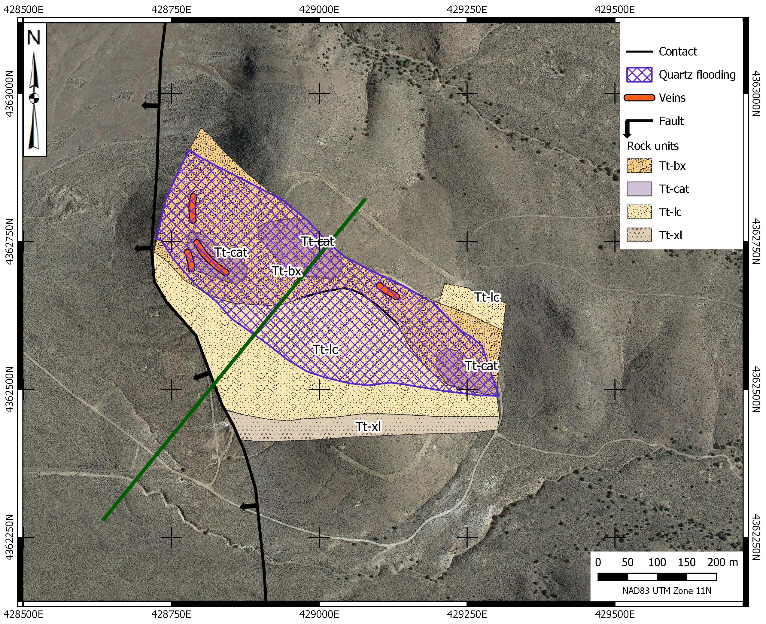 The property is underlain by a west to southwest dipping sequence of rhyodacitic tuffs, grading from a crystal tuff at lower elevations (Tt-xl) through a lithic-crystal tuff (Tt-lc)to a lithic tuff breccia (Tt-bx) capping the hill on which exposed mineralization is centred. The capping tuff-breccia is cut by internal cataclasites (Tt-cat), likely primary features generated during slumping of an over-steepened hot volcanic pile. Gold mineralization occurs in the upper unit and a portion of the underlying lithic-crystal tuff and consists of two phases of silicification. An early phase is wide spread, pervasive and consists of centimeter-spaced quartz veinlets and interstitial quartz flooding. This style of mineralization contains subeconomic gold and silver, averaging 0.113 g/t Au and 2.81 g/t where thoroughly drill tested in the centre of the property. The second phase of mineralization consists of quartz-chalcedony veins, exposed for up to 70 m in the west face of the central hill and up to 2 m thick. These are classic low sulphidation epithermal veins showing quartz after calcite (QUAC) texture, brecciation and annealing, ginguro banding and clots of pyrite and silver sulphides and sulphosalts. Historic grab sampling of these veins returned assays up to 64.9 g/t Au and 1,280 g/t Ag while initial sampling by Silver Range in 2016 returned grab samples up to 20.1 g/t Au and 1,770 g/t Ag from similar material. A vein drill intersection by ASARCO in 1983 (CS83-03) returned 3.05 m @ 4.25 g/t Au.