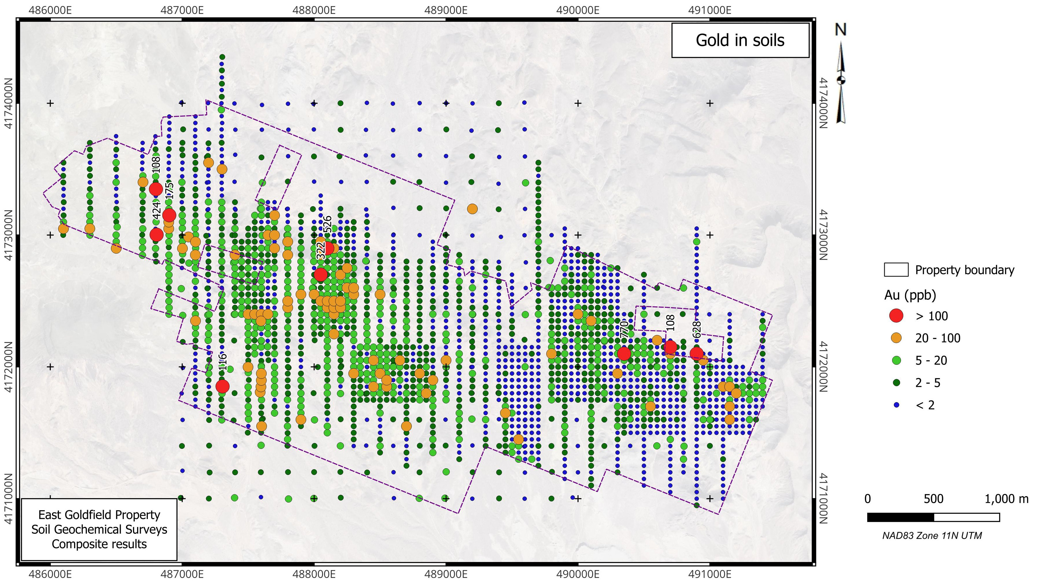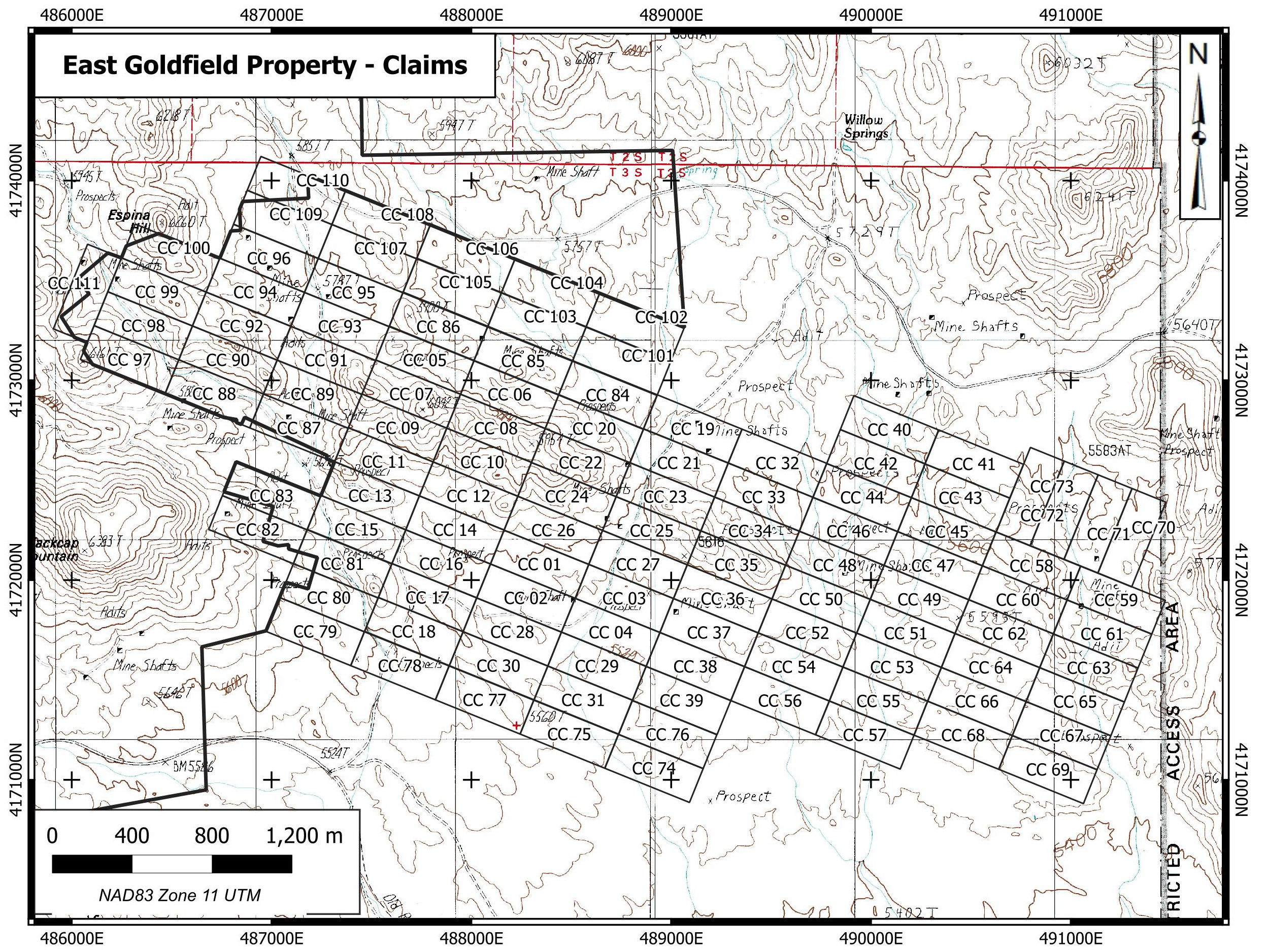 East Goldfield is a high sulphidation gold target 12 km east of Goldfield, Nevada. The property is centred at 37º 41’ 56” N 117º 7’ 41” W in Section 11, Township 3S Range 43E, Nye County, NV. The East Goldfield Project is accessible from Goldfield by road with a 4WD vehicle. The property currently consists of 110 Federal Lode Claims, sandwiched between Centerra Gold Corp.’s Goldfield Property and the Nellis Test Site (Air Force bombing range).