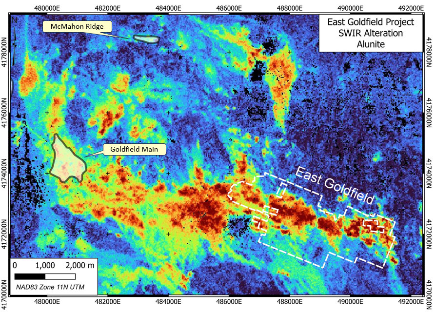 Mapping by the USGS in the early 1970’s in the East Goldfield Project area shows the area is underlain by Milltown Andesite, Goldfield Dacite and a hydrothermal breccia. The breccia is intensely altered and contains clasts of both the Milltown Andesite and the Goldfield Dacite. Stream sediment and soil geochemical anomalies indicate that this unit is weakly anomalous in gold, silver, bismuth and copper – key pathfinder elements for high sulphidation deposits. The Tom Keane Mine is on the southern margin of the breccia unit. The property is centred on an intense alunite anomaly defined by hyperspectral imagery. Alunite is a key characteristic alteration mineral found in high sulphidation systems.