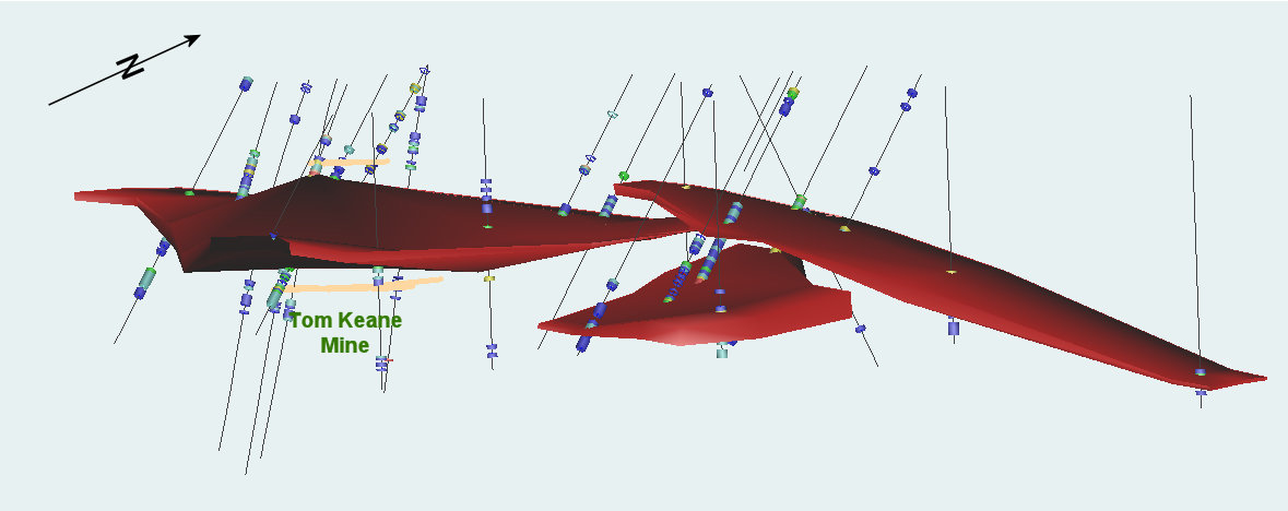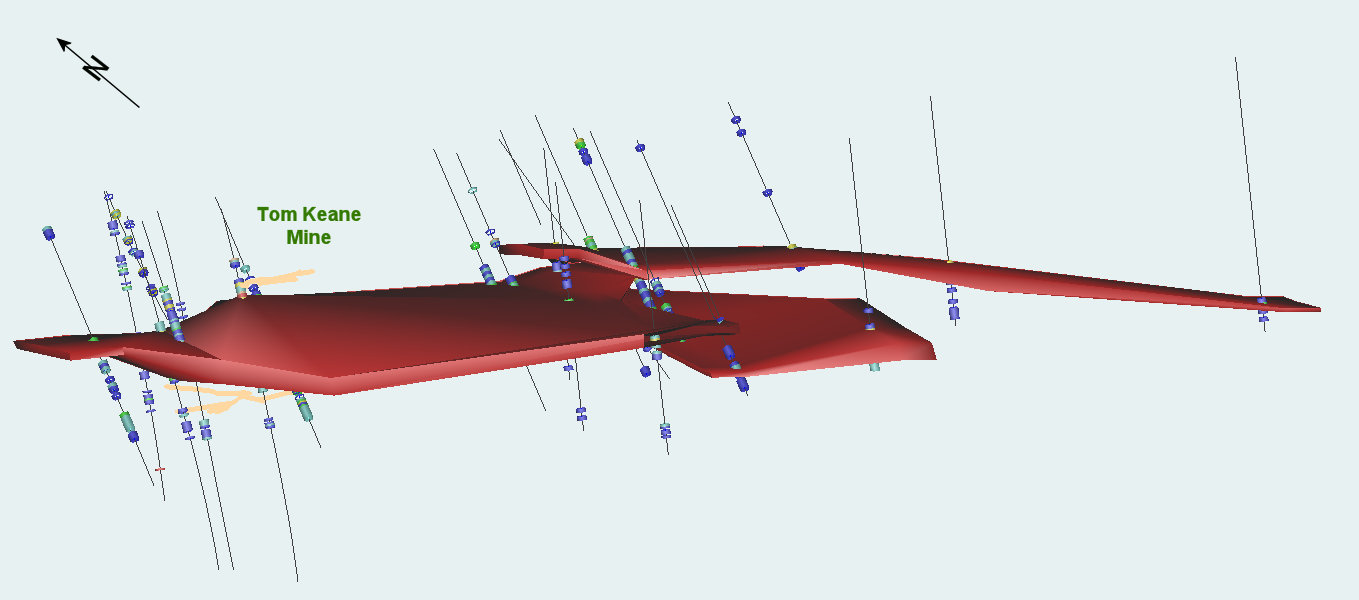 In 2025, Silver Range obtained historic data describing the 1993 to 1995 work program conducted by Cameco and containing additional earlier drill data. With this and ATAC drill data, Silver Range has been able to define an Exploration Target in the area of the Tom Keane Mine of from 2.26 to 6.0 Mt, grading between 0.34 to 0.62 g/t Au, containing 55,000 to 72,500 ounces of gold. A key insight from this work was the recognition that the gold-bearing horizon on the property is very gently dipping to flat at a depth of 150 to 180 m over much of the property.