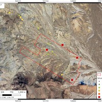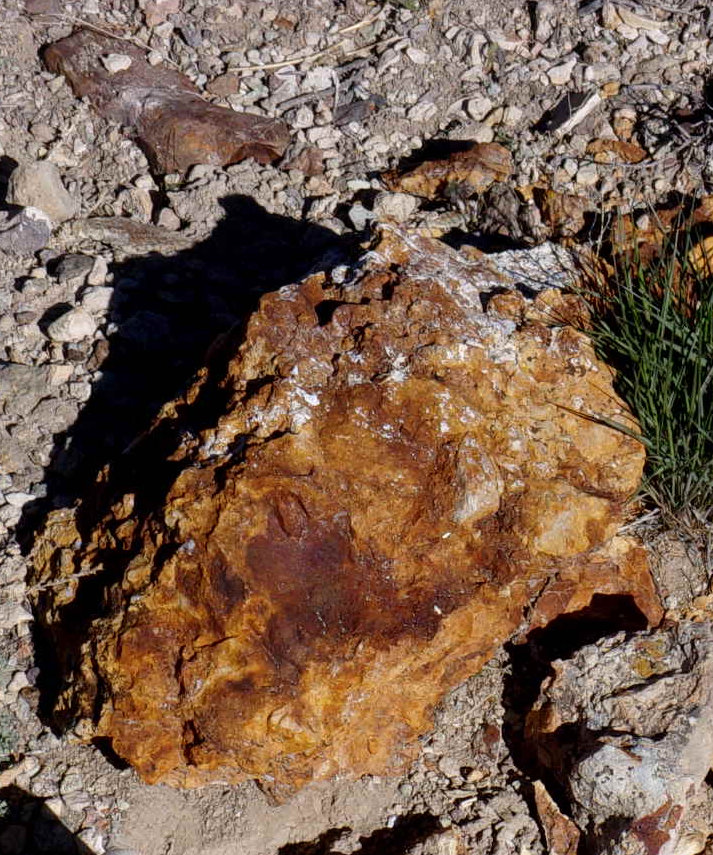 On the property, quartz-limonite-goethite-alunite / jarosite mineralization is found above the water table which occurs at a depth of about 60 m in the district. Quartz-pyrite-polybasite mineralization is found in veins below the level of oxidation and in some mine dump samples. Veins are up to about 4 m wide and persist in networks along strike for hundreds of metres near the Richardson – Hannapah Mine area. Best recent sampling results include 568 g/t Ag and 1.01 g/t Au from a composite sample of dump material at the Richardson Mine; 598 g/t Ag from a nearby grab sample; and 2.42 g/t Au and 301 g/t Ag from altered rhyolite northeast of the Richardson Mine.