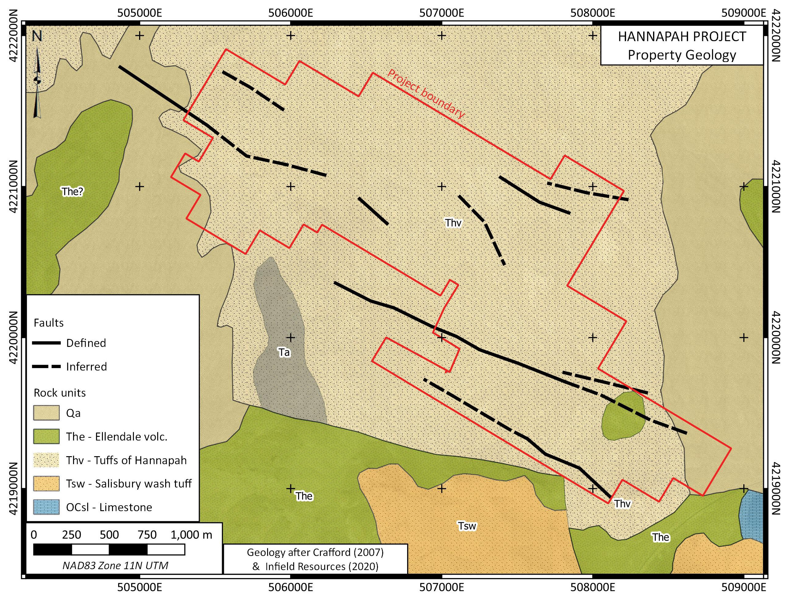 The property is underlain by Oligocene volcaniclastic rocks and lesser rhyolite cut by west-northwest trending faults. These structures host low sulphidation epithermal silver – gold mineralization in veins and stockworks. The faults are possibly part of a much larger horse-tail fracture zone at the western termination of the Kawich Toiyabe Lineament. This prominent regional structure, either a strike slip or normal fault, extends for 80 km from the Reveille Range in the east to the Monitor Range, east of Tonopah. The Reville, Bellehelen, Ellendale and Hannapah Mining Districts – all host to epithermal gold & silver mineralization – occur along the Kawich Toyaibe Lineament. ASTER hyperspectral data and structural considerations indicate that the Hannapah Project lies in a zone of horse-tail fault deformation marking the end of the structure.