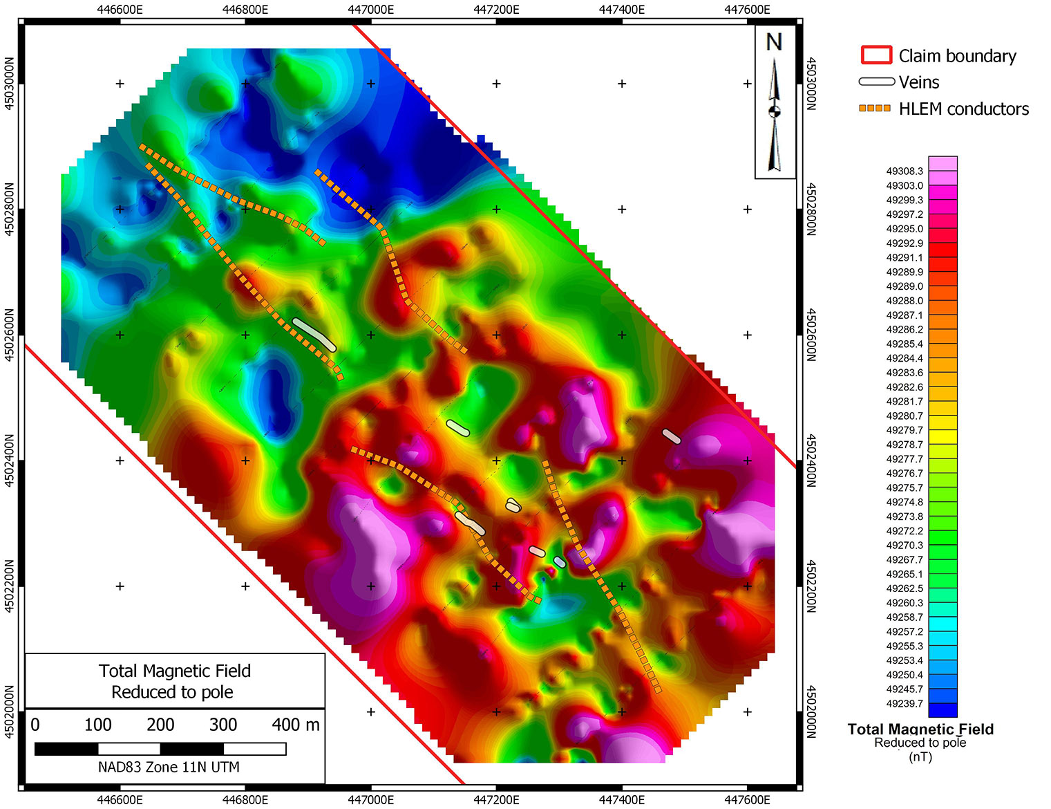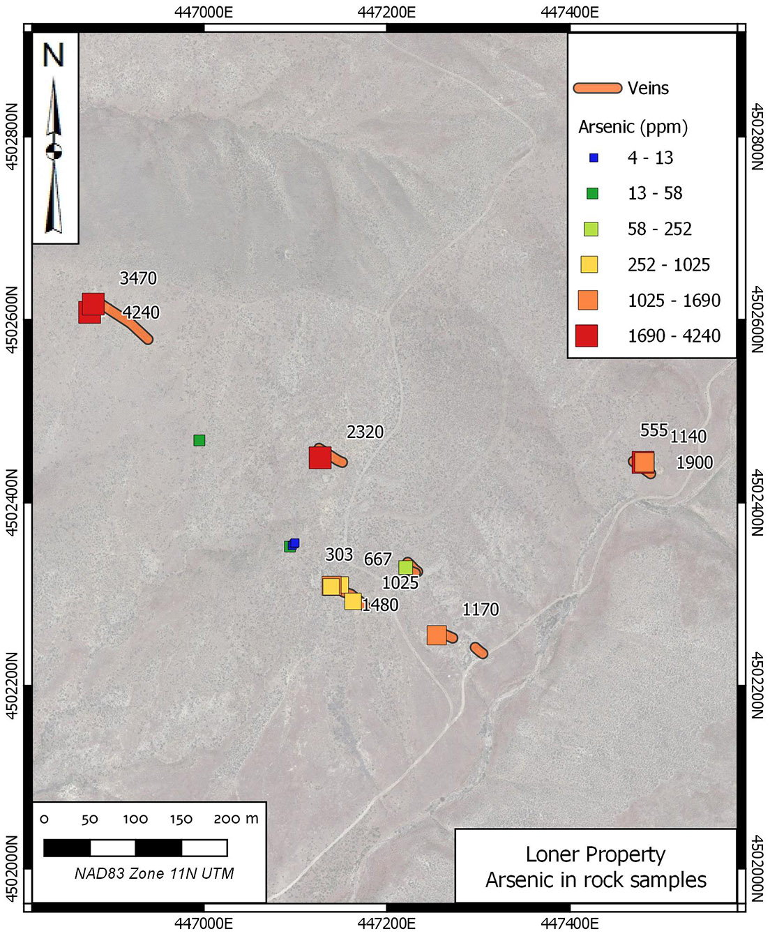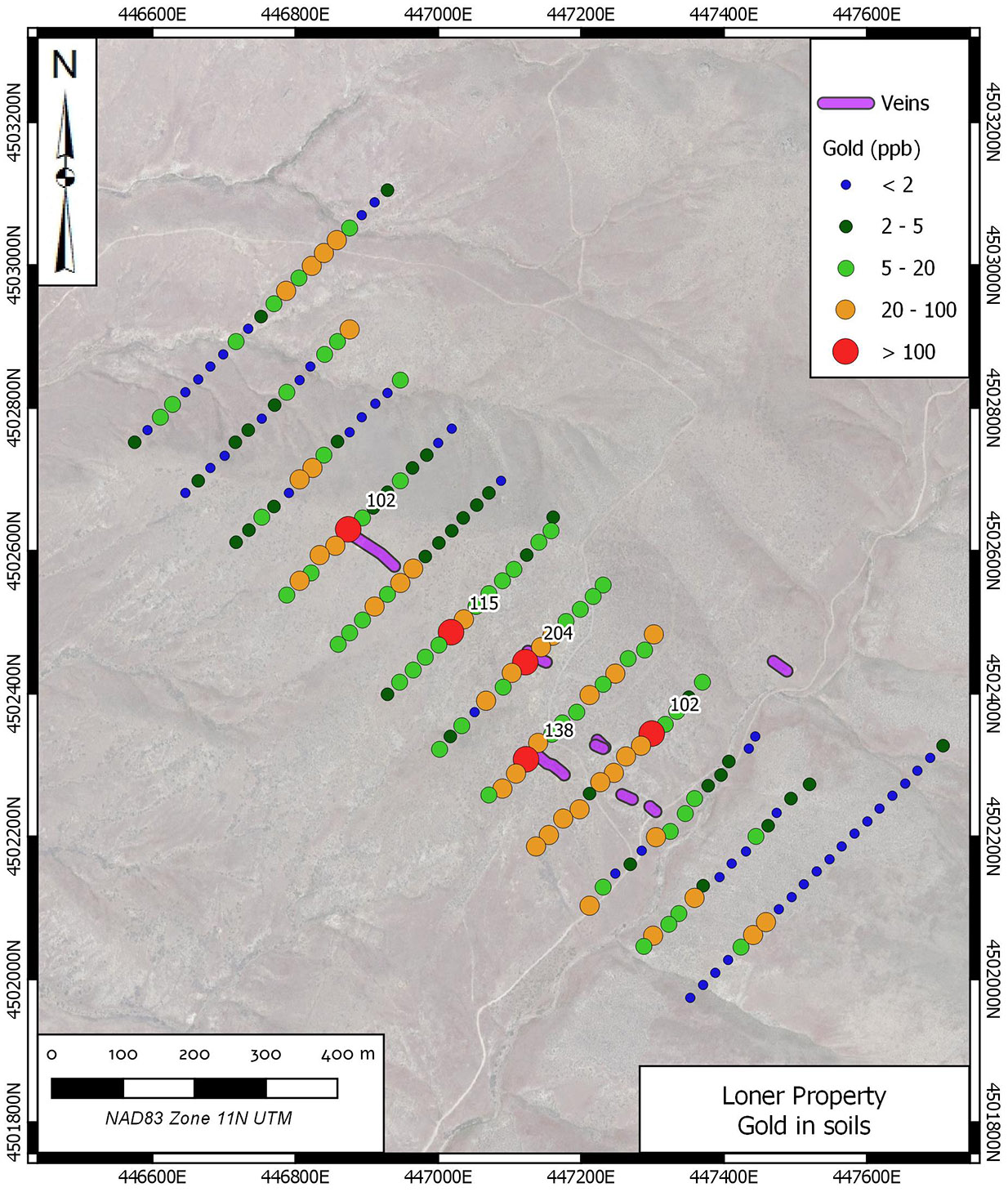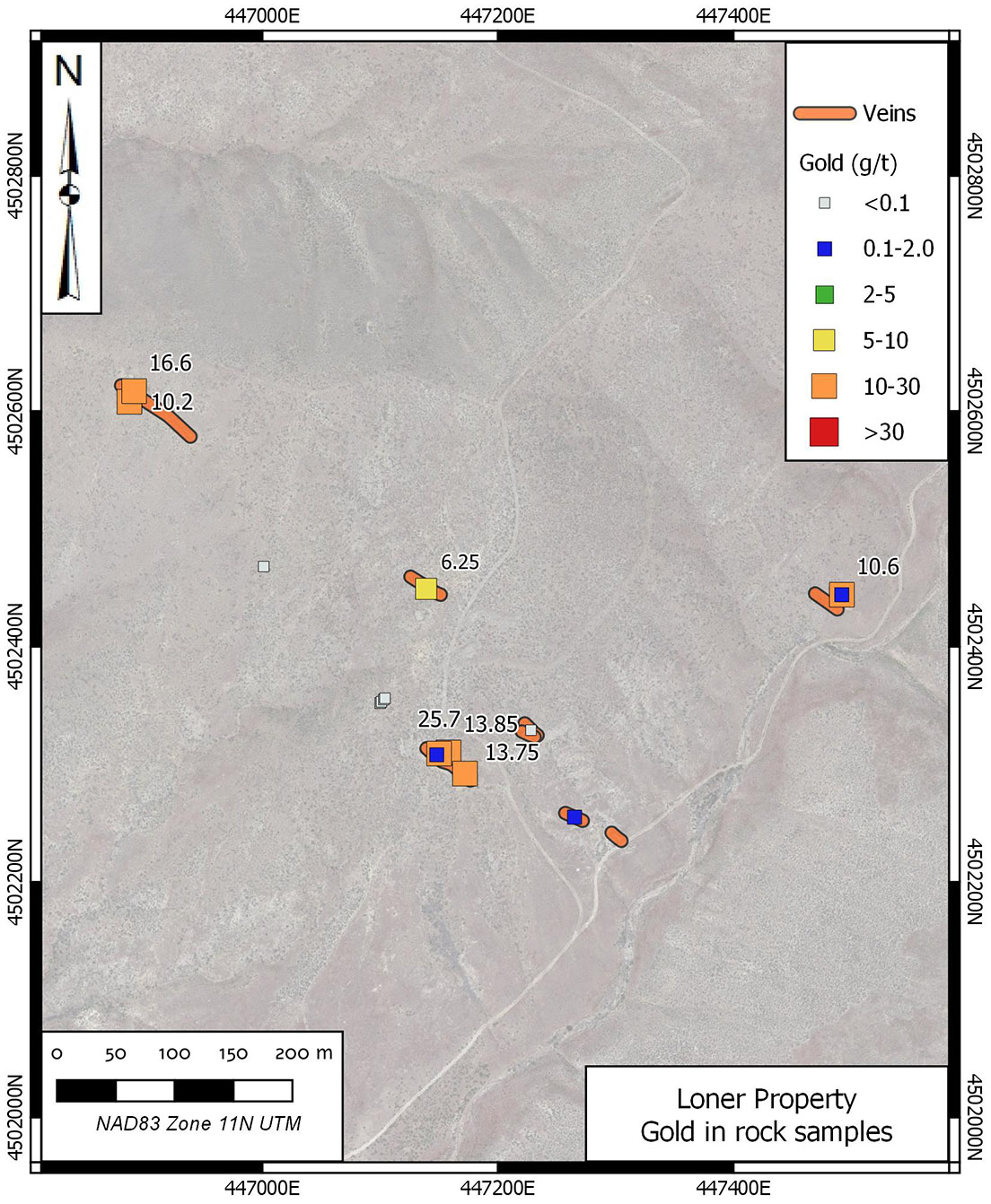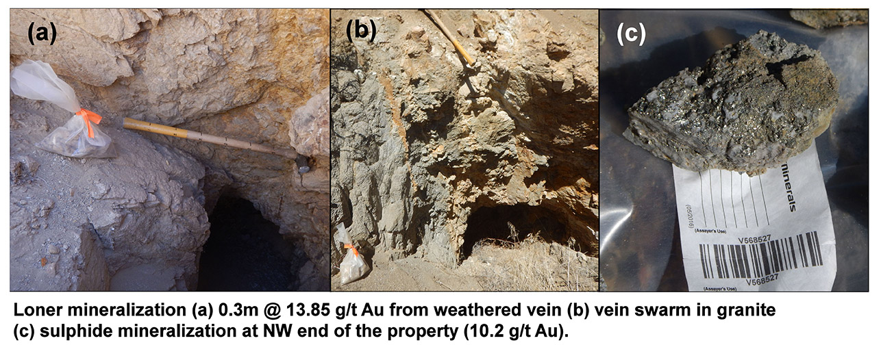 The Loner Property is underlain by Tertiary granite & granodiorite and small roof pendants of older metamorphosed andesite and argillites. At the principle showings, the granodiorite is cut by a series of WNW to NW striking, NE dipping quartz-adularia-clay veins from 0.5 to 2.0 m wide. In the southeastern portion of the claims, the veins contain trace to weakly disseminated sulphides whereas to the northwest, another vein system contains heavy concentrations of arsenical marcasite and pyrite. With the exception of the shaft dump mineralization at the northwest showing, all other recovered vein material recovered is heavily oxidized to black, orange and yellow wad. The exposed mineralization is notably high grade; 6 of 8 samples recovered from the workings during reconnaissance returned assays greater than 6.0 g/t Au. Best grab sample results were 16.60 g/t Au from a select waste dump specimen and the best channel sample returned 1.83 m @ 25.7 g/t Au from the brow of an adit in the main mine workings. Mineralized specimens also returned high values of arsenic (to 4240 ppm As) and anomalous values of phosphorus (to 1020 ppm P). There is a large soil geochemical anomaly associated with the surface mineralization. Horizontal loop electromagnetic field surveys have defined bedrock conductors associated with the known surface showings.