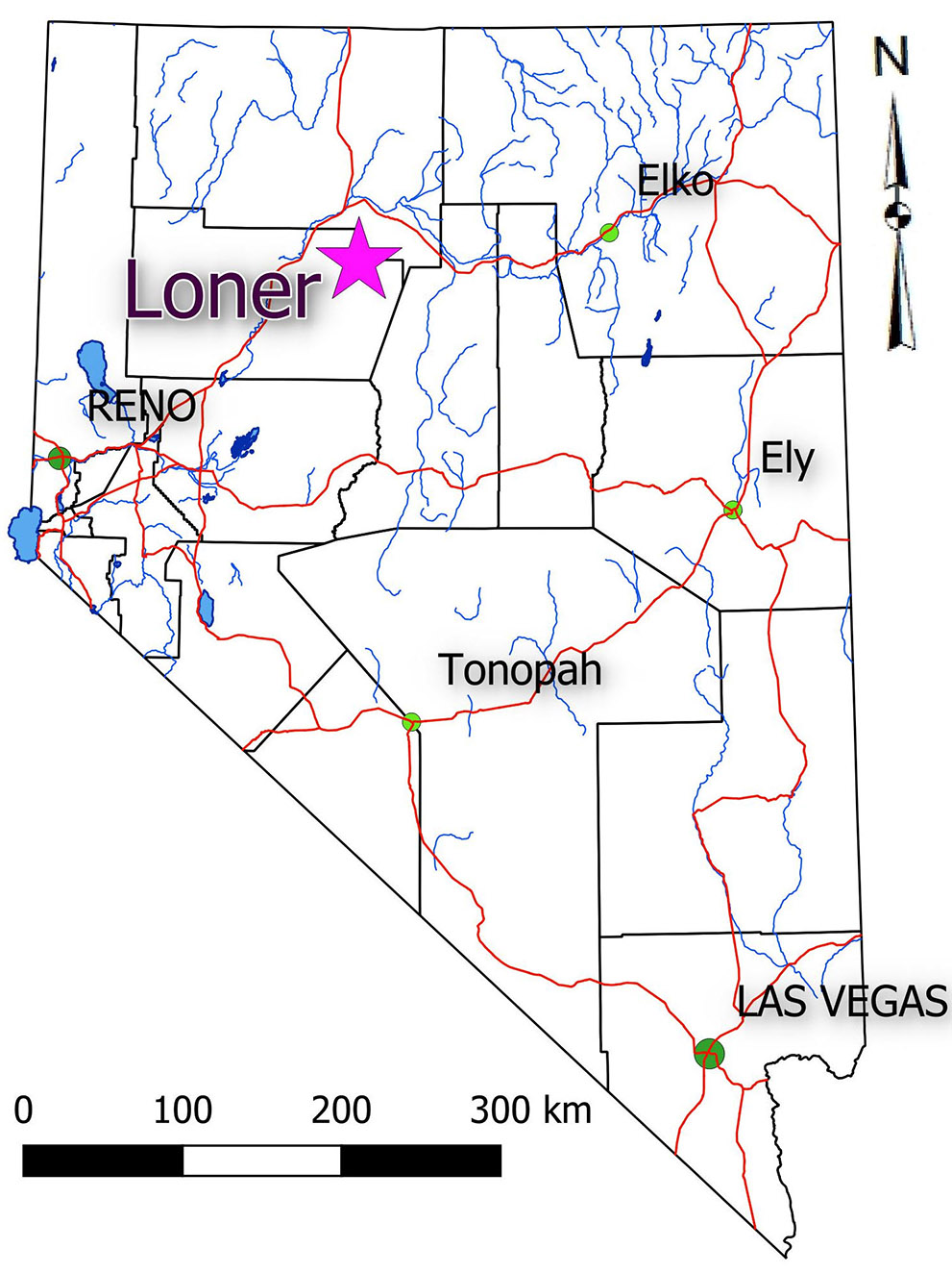 The Loner Property is located in Pershing County, 35 km south of Winnemucca and covers a series of shafts, adits, trenches, and open stopes driven on quartz veins in host granitic rocks near Washoke Canyon. The project is across Grass Valley and 12 miles north of the Goldbanks Deposit (current resources 557,000 oz Au). There are strong similarities between Loner and the Goldbanks Deposit in terms of geological setting and style of mineralization found at each.