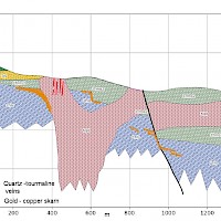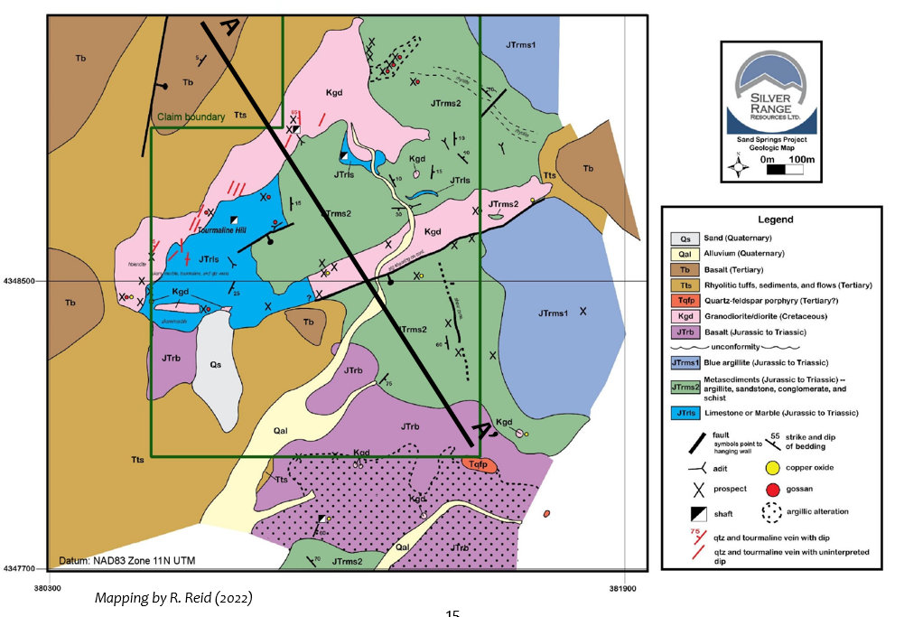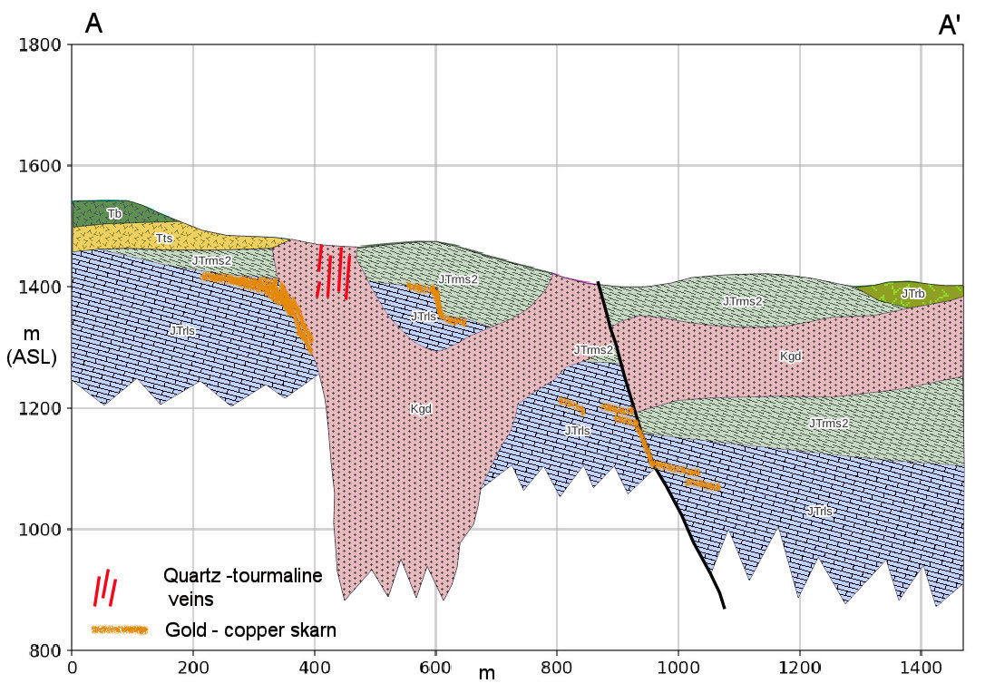 The property is underlain Triassic through Jurassic volcaniclastics, limestone and basalt. These rocks are intruded by a northeast-striking Jurassic / Cretaceous granite to granodiorite with a source likely 200-300 m below surface and two apophyses which reach surface. There is widespread gold-copper skarn mineralization and intrusive-hosted gold-quartz-tourmaline vein mineralization on the property. Surface sampling by Silver Range to date has returned up to 1.5 m @ 10.1 g/t Au from a chip sample and up to 3.50% Cu from a grab sample, both of gold-copper skarn mineralization. Grab samples of the quartz tourmaline vein material have returned up to 2.94 g/t Au.