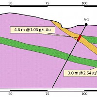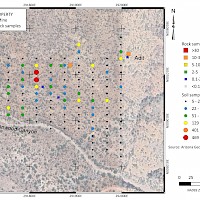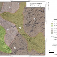 The Tesoro Project area is mostly underlain by Mid-Proterozoic granite. This unit hosts gold occurrences throughout northwestern Arizona, primarily in steeply-dipping northwest trending structuers. Historic reports describe two styles of gold mineralization on the property. The first consists of narrow, northwest-striking, steeply dipping quartz veins carrying high grade gold values, a style of occurrence common in these rocks. The second, noted at the Organ Grinder Mine, consists of wider, gently dipping altered granite carrying gold in the 1-5 g/t Au range. The latter was of particular interest to recent exploration groups who saw the potential for the property to host low grade, bulk tonnage gold amenable to heap leaching. At the Big Ben Mine, surface rock samples collected by Sage Gold returned up to 52 g/t Au while soil samples returned up to 9.2 g/t Au. A soil grid installed at this showing by HiMac Resources Ltd. detected a strong gold-in-soil anomaly, open on strike, with sample responses up to 1,500 ppb Au.