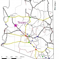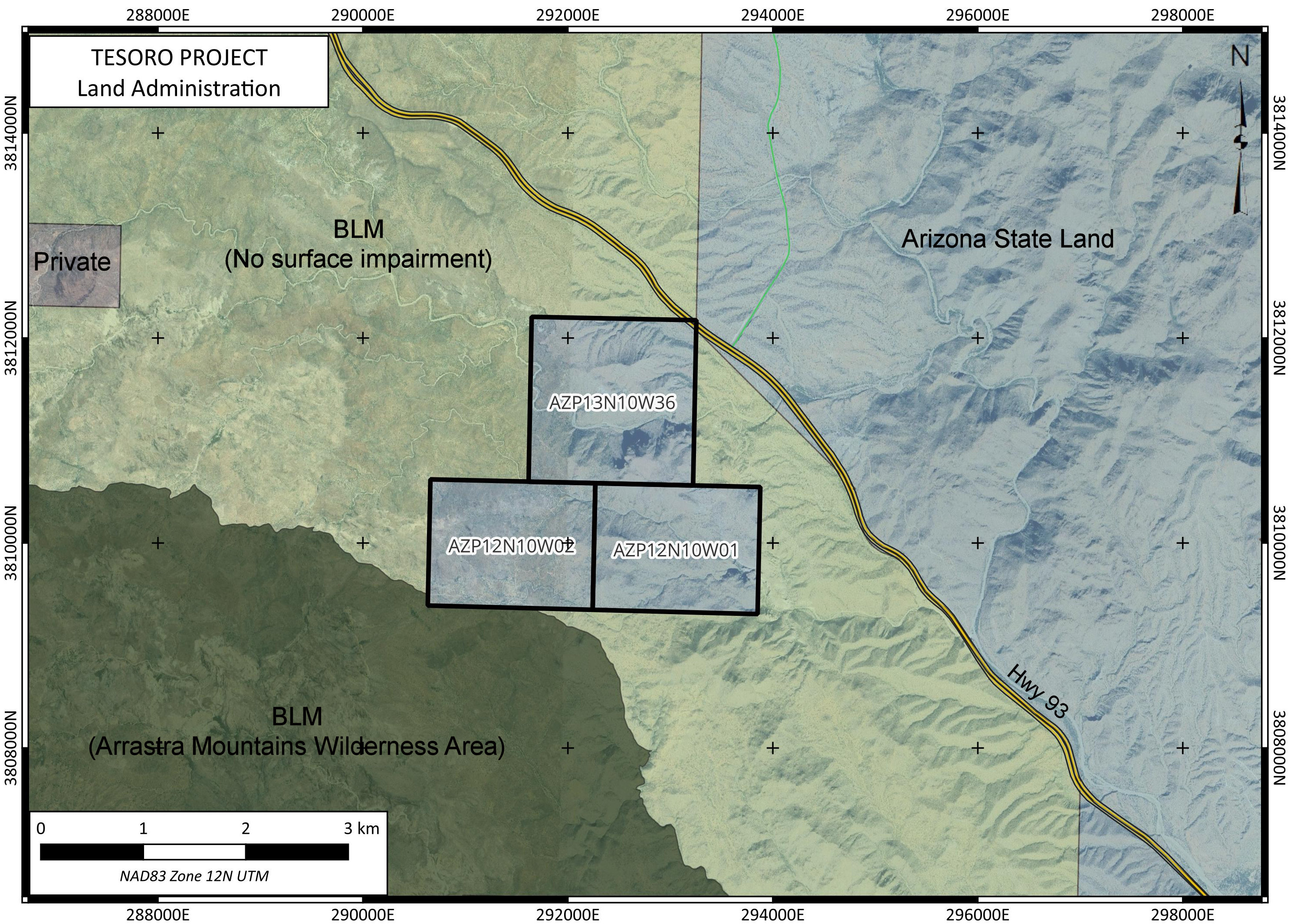 The Tesoro Project is centred at 34° 25’ N 113° 15’ W in Yavapai County, Arizona and covers all of Section 36, Township 13 N, Range 10 W and Sections 1 and 2, Township 12N Range 10W. The Property is 70 km northwest of Wickenburg. The principal showings on the property can be reached by road with a four-wheel drive high-clearance vehicle with access off Highway 93.