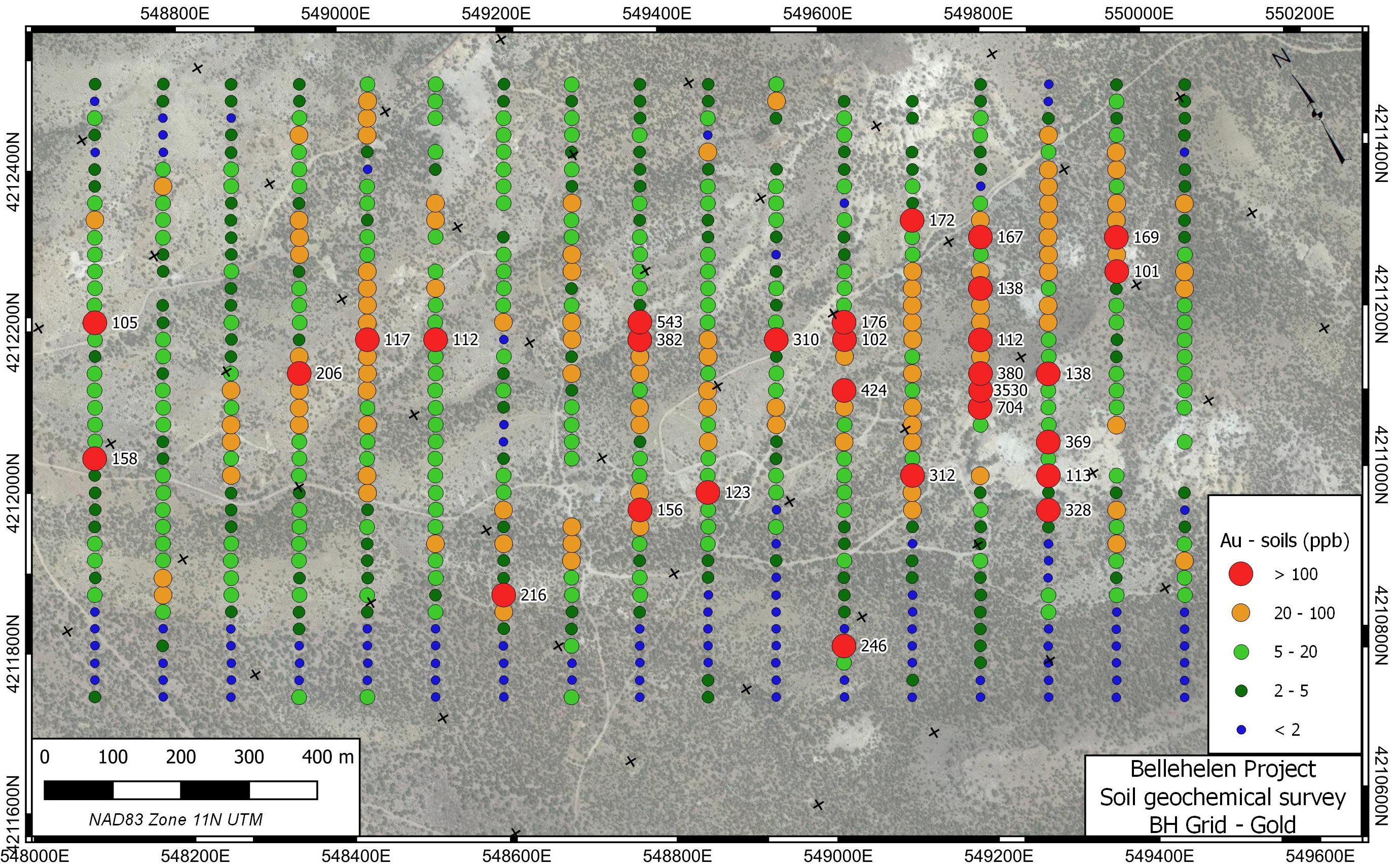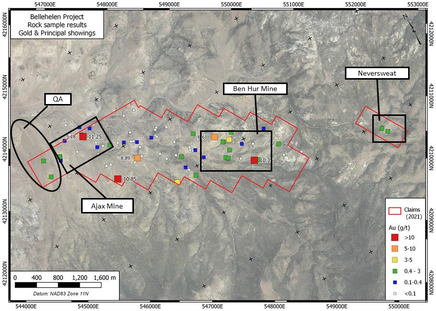 Low-sulphidation epithermal gold & silver mineralization occurs in two settings at the Bellehelen Structurally-controlled low-sulphidation silver & gold style mineralization is found at most of the historic occurrences. Steeply-dipping fracture / shear zones with quartz veinlets and thin stringers host mineralization in this setting. Coarse to chalcedonic (rarely opalescent) quartz with disseminated pyrite and rare galena, cerargyrite and free gold occurs in the district. Most of the vein material is highly oxidized to limonite, goethite and other sulphide alteration products. Nontronite is noted near the Ben Hur Mine. Dump and in-place surface grab samples of this material have returned up to 11.25 g/t Au and 1,490 g/t Ag. Very strong gold-in-soil response is noted with this style of mineralization in the area of the Ben Hur Mine with soil samples running up to 3,530 ppb Au along a trend extending more than 1000 m. The other style of low-sulphidation is stratabound quartz-adularia flooded pyroclastics with disseminated pyrite at the QA grid. Best analyses to date of this potentially extensive material to date are 0.747 and 0.622 g/t Au from samples on the QA Grid in the northern portion of the property.
