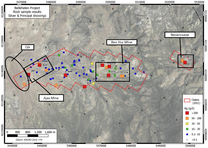Silver and gold were discovered in the Bellehelen Mining District around 1904. The area saw limited production from 1909 to 1927 and sporadic production during the 1930s. Total documented production, mostly from the Bellehelen (Merger) Mine and adjacent Peterson Mine, is estimated at approximately 311,000 ounces silver-equivalent. This estimate does not include minor production from smaller workings throughout the mining camp. Mineralization in the Bellehelen district is low-sulphidation in character, hosted in secondary E-W striking secondary normal faults within the regional scale Bellehelen Fault Zone, a component of the larger Kawich-Toiyabe Lineament. The project area is entirely underlain by rhyolitic ash flow tuff and megabreccia (crater collapse) deposits of earliest Miocene age. Mineralization likely occurred following crater collapse driven by hydrothermal circulation along master faults in the Bellehelen Fault Zone.
