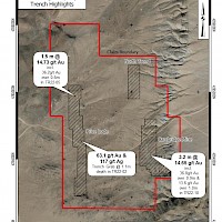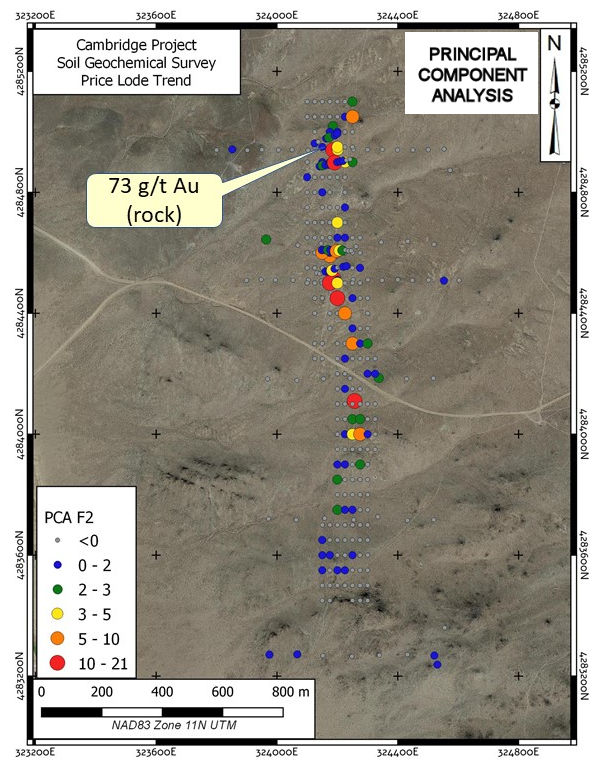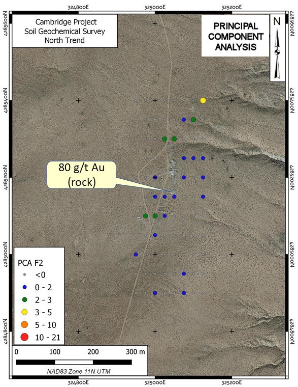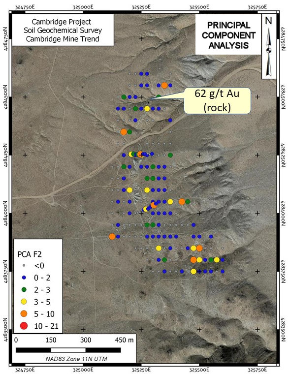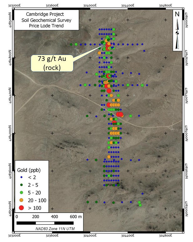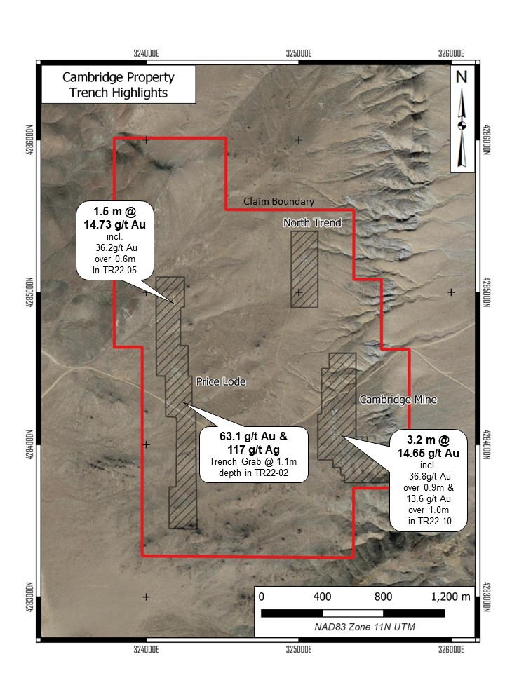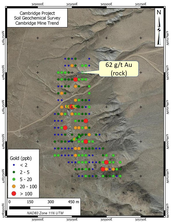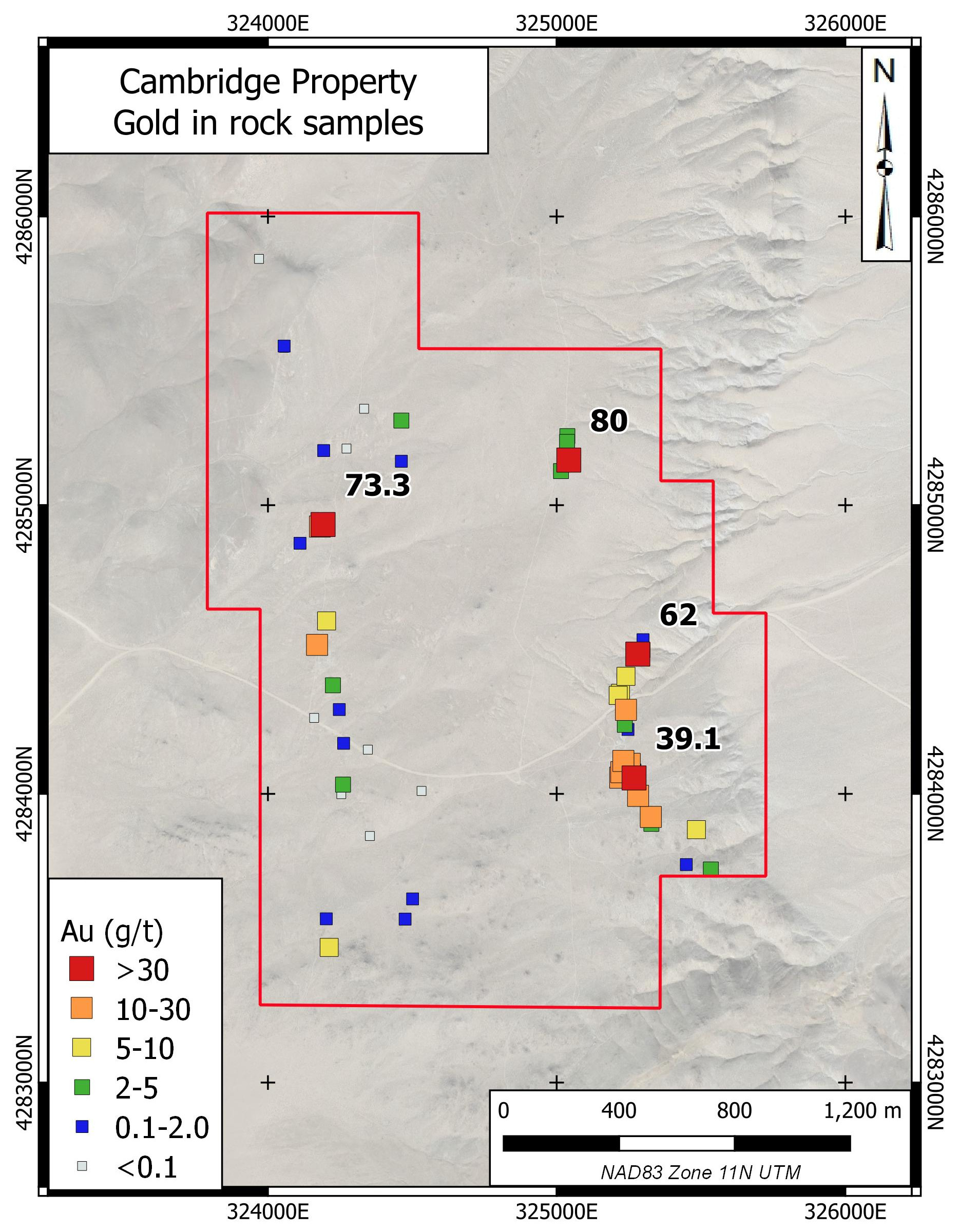 The Cambridge Property is underlain by Cretaceous quartz monzonite overthrust by Tertiary andesite in the northwestern corner of the property. Outcrop is sparse on the property but there is no indication of deep overburden with sparse bedrock outcrop common throughout the claims. The quartz monzonite is medium to coarse grained and is cut by north to north-northwest trending, apparently steeply-dipping faults or shears which host the gold mineralization. The mineralization located to date consists of quartz veins up to 20 cm wide in the few exposed areas and reportedly up to 2.0 m in some mine workings. The quartz is coarse grained, locally laminated and carries disseminated pyrite, pyrrhotite, chalcopyrite and rare galena, tetrahedrite and amorphous black sulphides. Most sulphides are weathered and pyrite boxworks, malachite and rare yellow cerrusite together with limonite and hematite are more common. The selvages of the veins are clay altered but not significantly more than the surrounding bedrock. The property is distal from any volcanic centres and the style of mineralization is interpreted to be mesothermal. Grab sampling on the property to date has recovered 68 samples with 20 (29%) assaying greater than 5 g/t Au and the best sample returning 93.8 g/t Au. Trenching on the property returned up to 3.2 m @ 14.65 g/t Au. The Cambridge Mine was noted for visible gold and this been recovered from waste dumps samples at the Cambridge Mine.