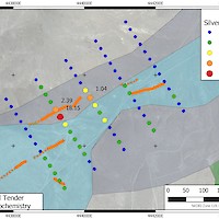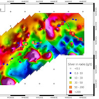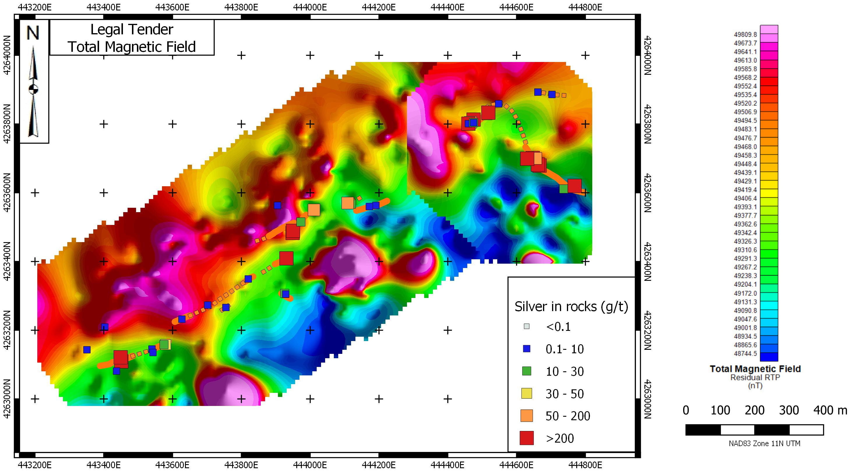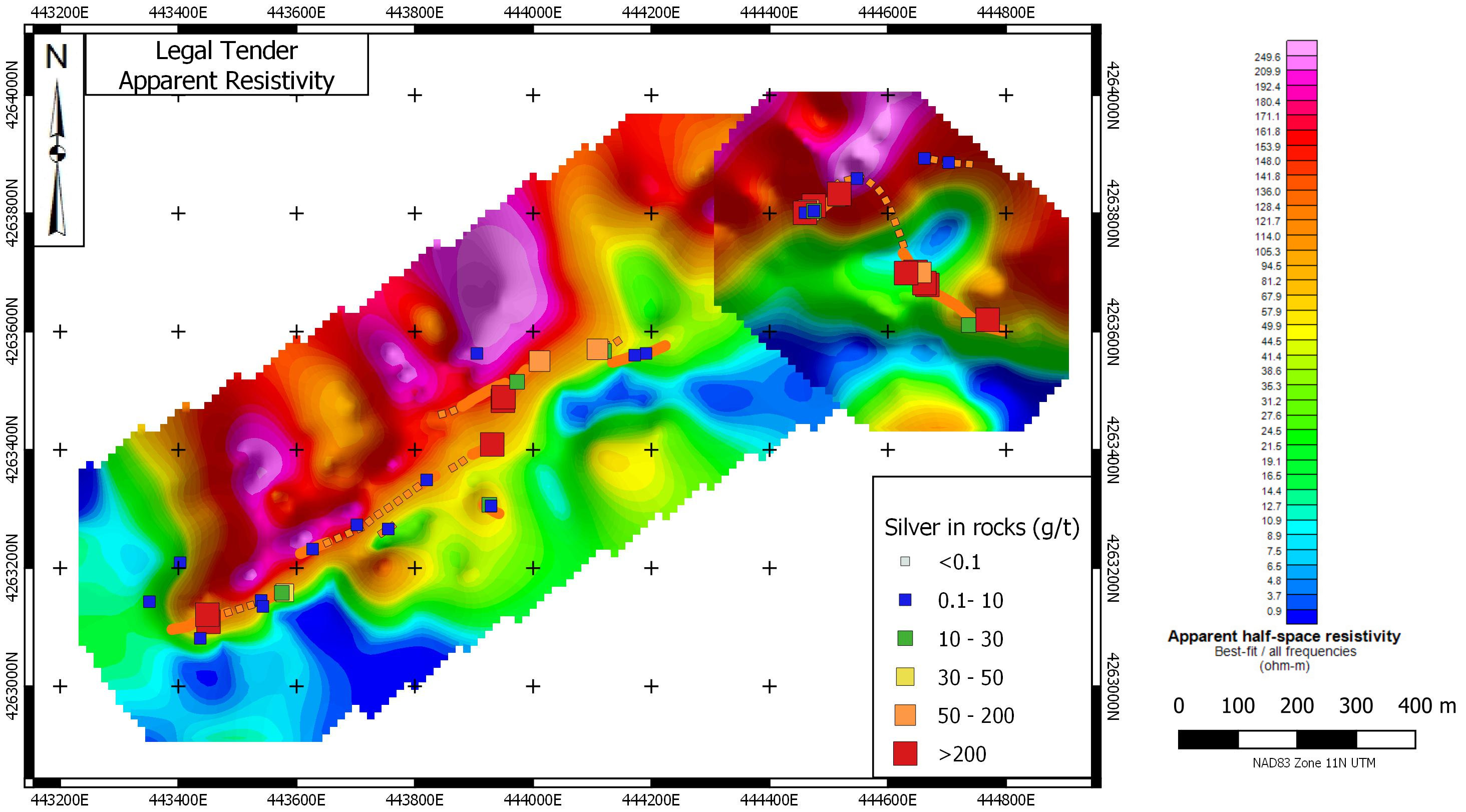 The Main Trend contains veins spanning a strike length of more than 1200 metres. At the southwestern end, high grade silver mineralization occurs in the Farris Mine, high-graded during the peak of activity in the area in the period 1913-1920. Best assays from this zone returned grab samples up to 1,875 g/t Ag. Further along strike, the Black Butte Mine produced between 1962 and 1968; grab dump samples from this location returned up to 1,130 g/t Ag. The Main Trend follows a pronounced apparent resistivity break along its length. Test soil surveys over this trend in 2020 indicated that grid soil sampling would be an effective means of locating veins under cover by means of their silver-in-soil response.