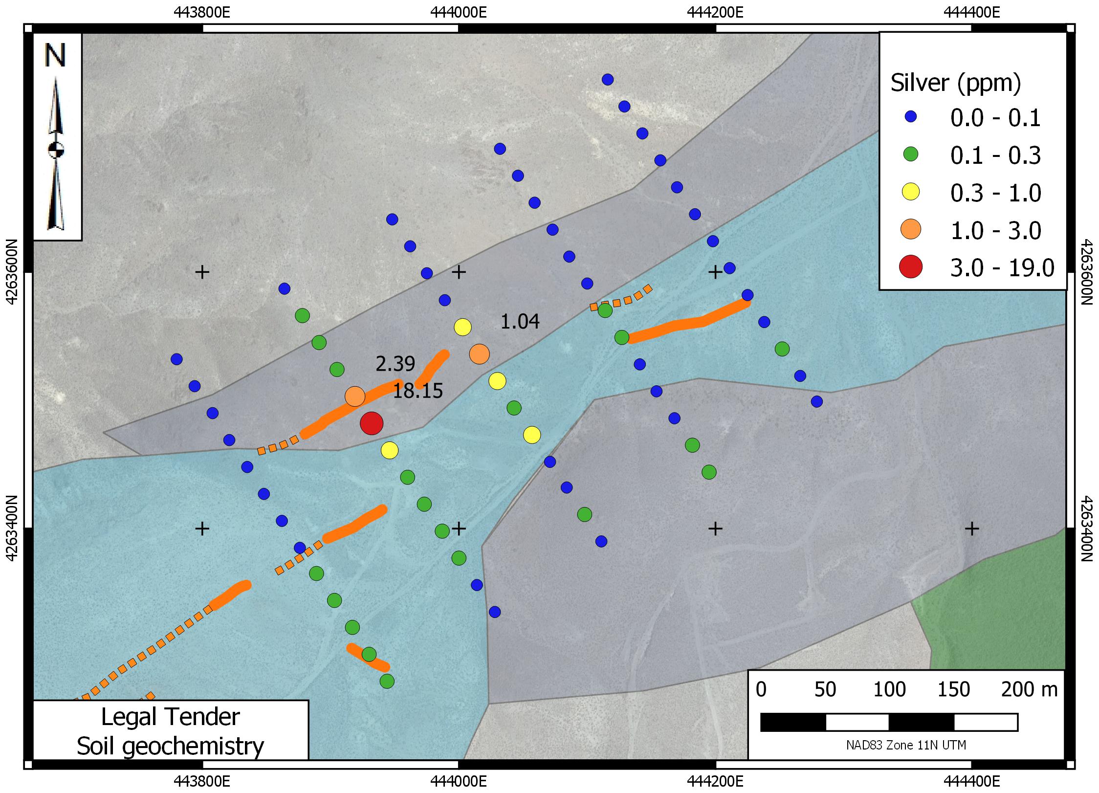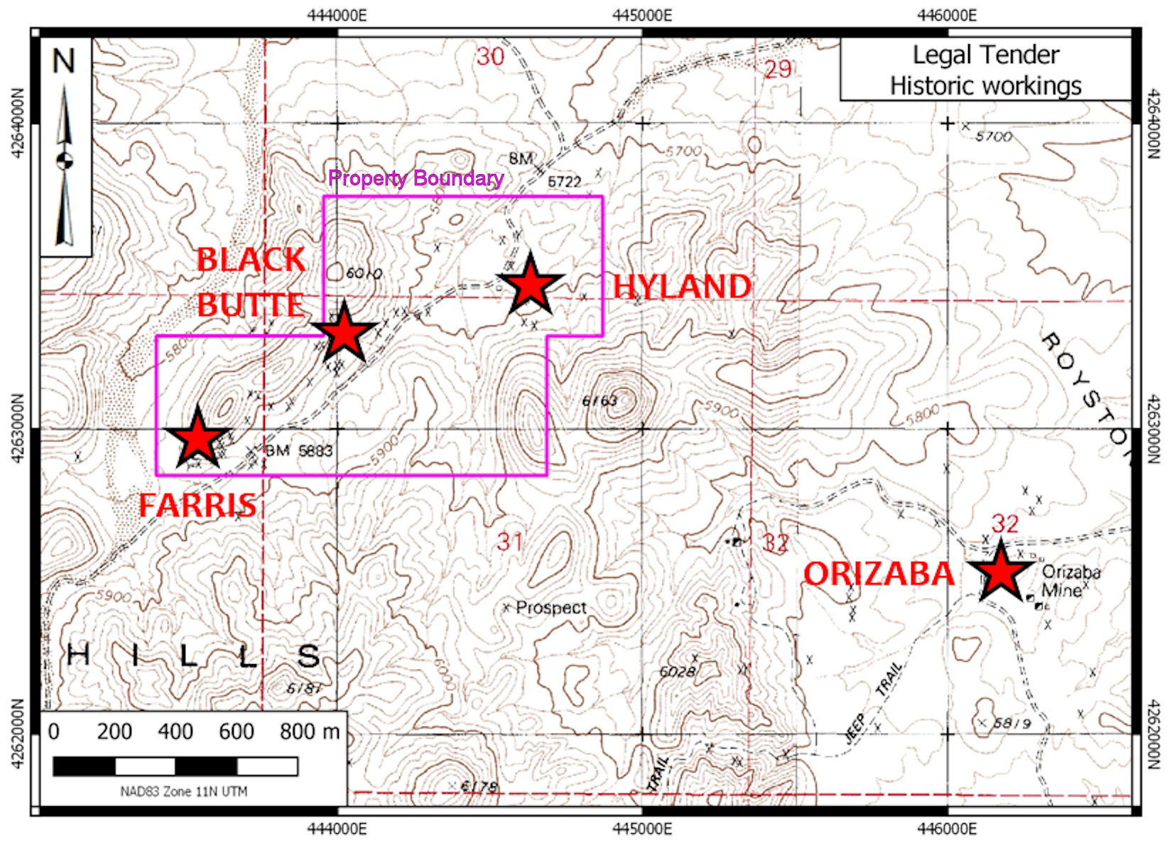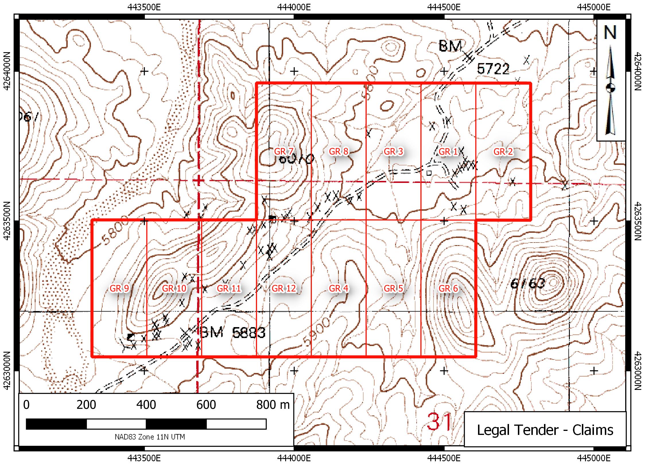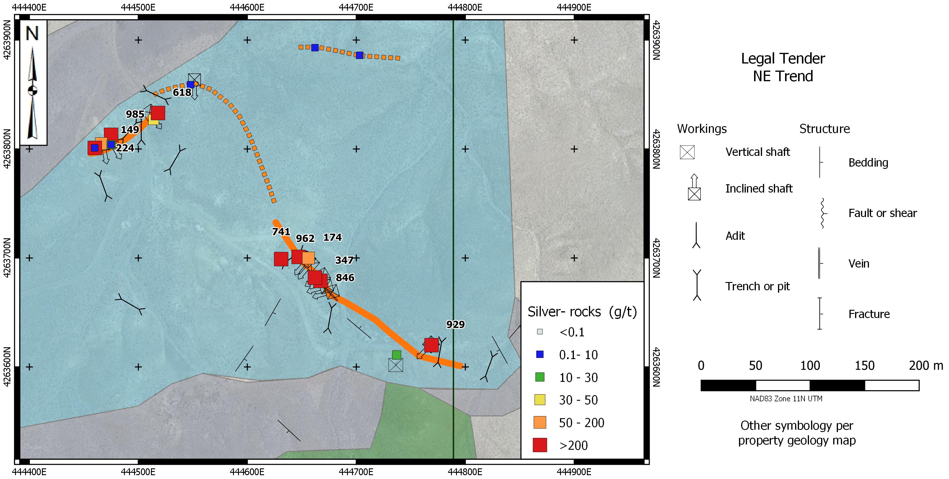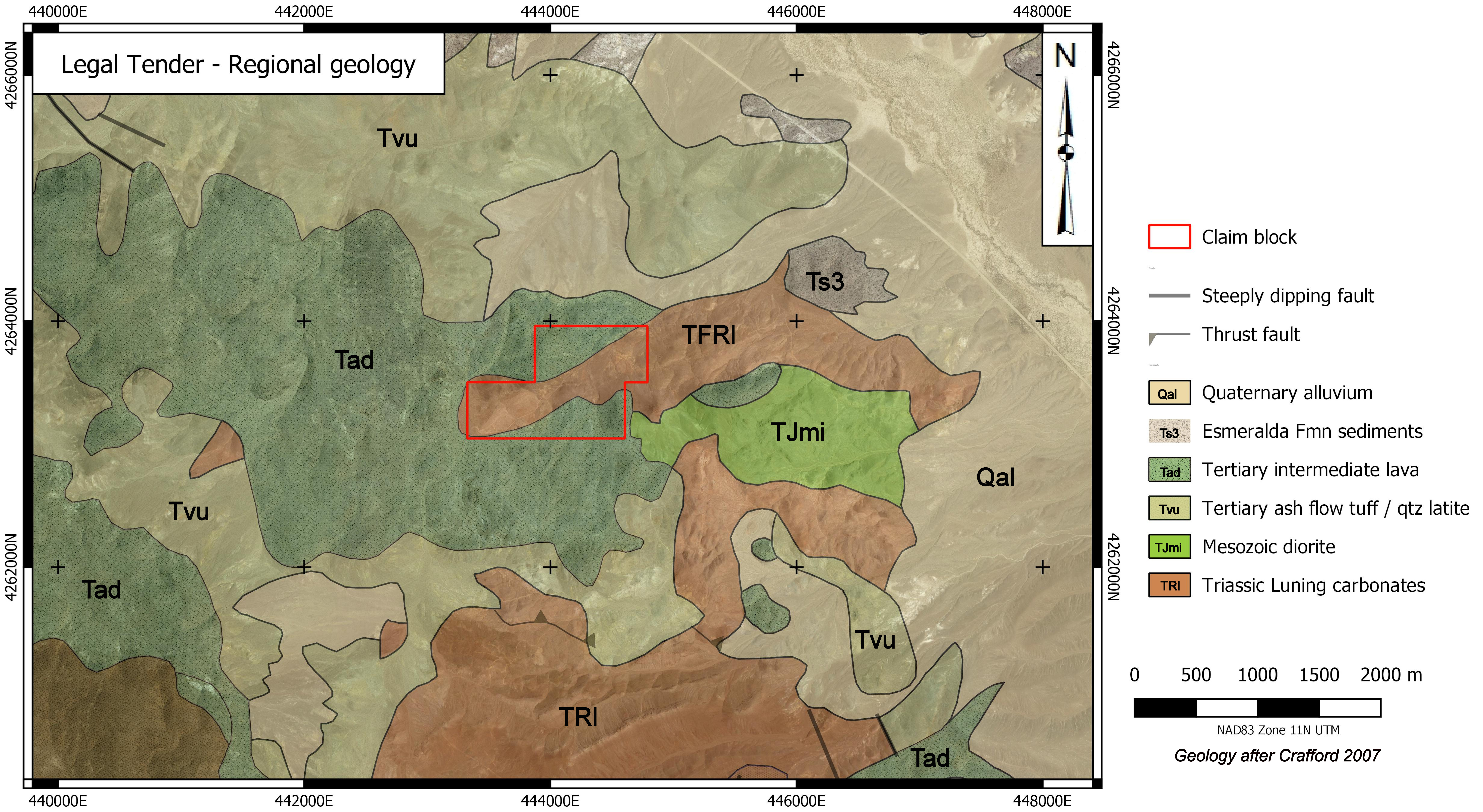 The Legal Tender Property is located in the Royston Hills in Nye County, approximately 62 km NW of Tonopah. The property covers Triassic carbonates and greenstones overlain by Tertiary volcanic rocks. Low to intermediate sulphidation mineralization occurs in veins exposed along a strike length of 1,600 metres in two trends (Main & NE Trends) . There are numerous prospect pits and shafts in these veins and notable past production from the Farris, Hyland and Black Butte mine sites.
