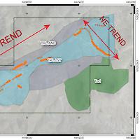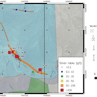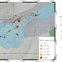 The NE Trend spans a strike length of 400 m and contains the Hyland Mine which produced between 1913-1920. Dump grab samples along this trend returned up to 962 g/t Ag and associated gold up to 4.94 g/t Au. The vein system was exploited heavily in the area of the Hyland Mine through a series of adjacent inclined shafts.