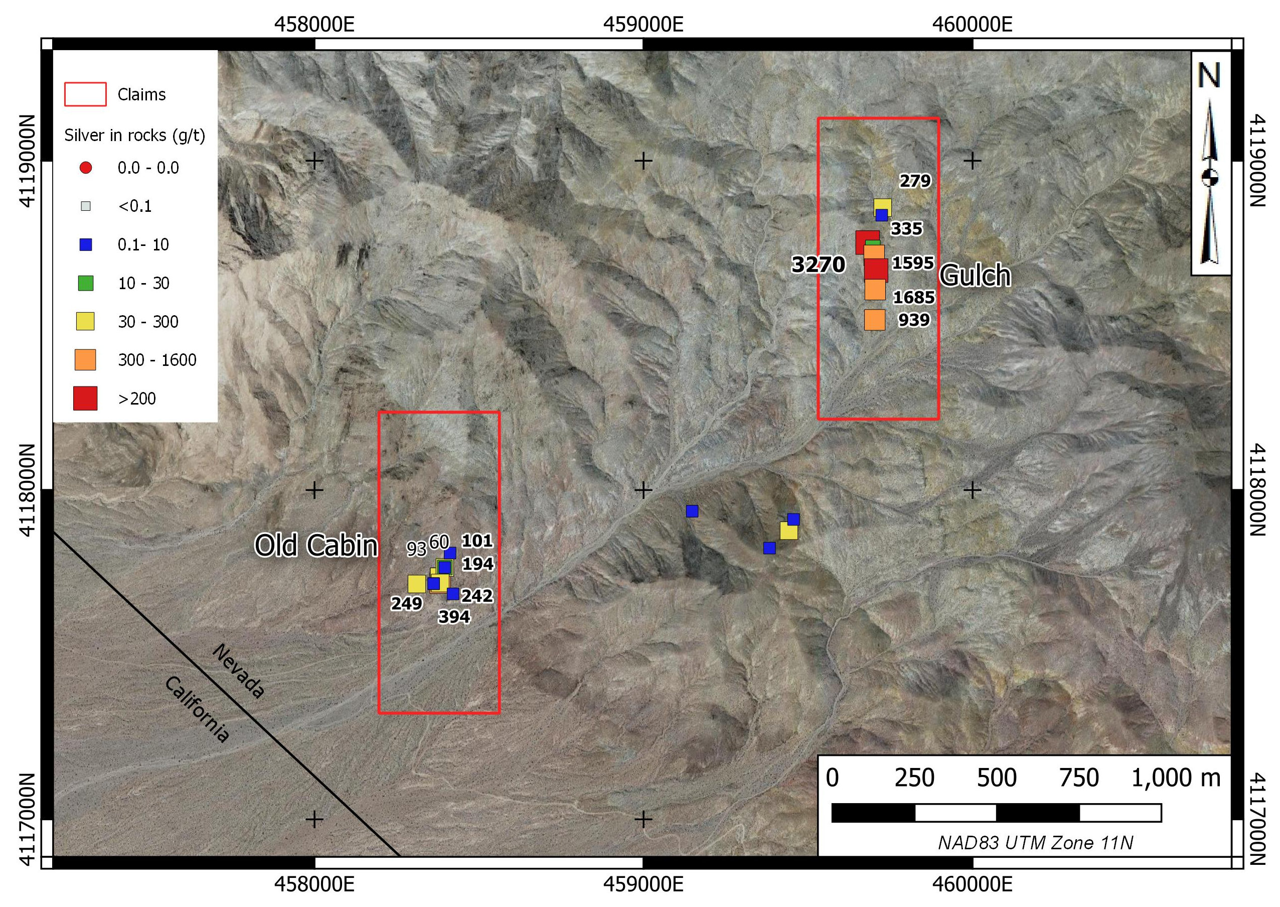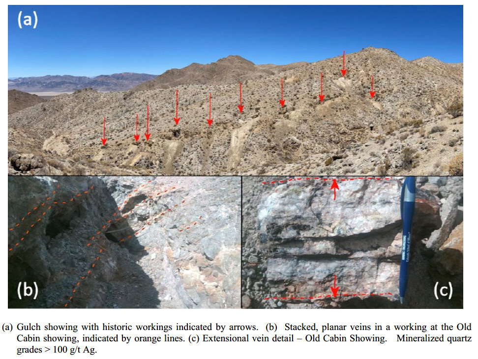 While there are numerous exploration workings dating back to at least 1917 in the Silver Mountain Property area, there is little documentation of past exploration or mineralization in the public record. The claims cover six Mineral Resources Data System (MRDS) showings. Most of the mineralization is at the Old Cabin (South Silver Mountain) and Gulch (North Silver Mountain) showings, where evidence of limited high-grade mining is evident. Nevada Bureau of Mines & Geology records document two samples in the area running 1500 and 3000 ppm Ag respectively with one sample returning 3.5 ppm Au. Silver Range examined, sampled and staked the property in March and June 2021.